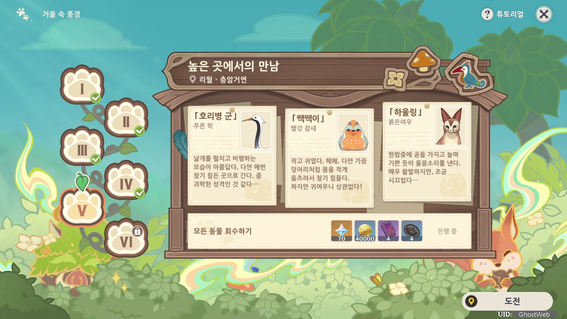 - 찾아야되는 동물 : 푸른 학 (호리병 군), 빨강 참새 (짹짹이), 붉은 여우 (하울링)