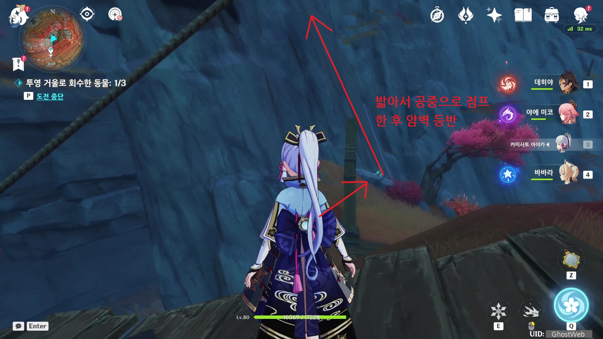 - 크레인 뒤에 바위 꼭대기에서 붉은 여우를 찾을 수 있는데, 꼭대기 오른쪽에 점프 포인트를 밟고 위로 점프하고 암벽 등반하세요.
