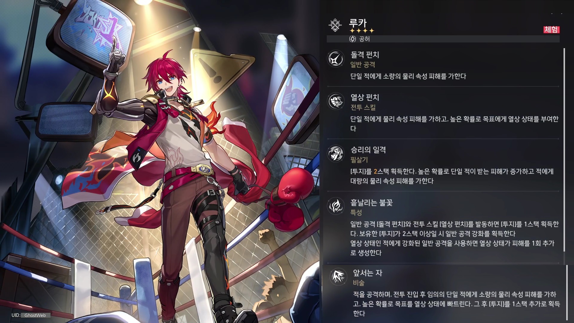 - 강화 - 루카는 일반 공격 돌격 펀치와 전투 스킬 열상 펀치를 발동하면 투지를 1스택 획득한다. - 투기는 최대 4스택을 보유할 수 있다. - 보유한 투지가 2스택 이상일 시 일반 공격 돌격 펀치는 [ 돌격 어퍼컷 ]으로 강화된다. - 강화된 일반 공격의 어퍼컷으로 열상 상태에 빠진 적을 명중하면 현재 받는 열상 상태는 기존 피해 6%만큼의 피해를 즉시 1회 생성한다. - 전투 시작 시 루카는 투지 1스택을 보유한다. |