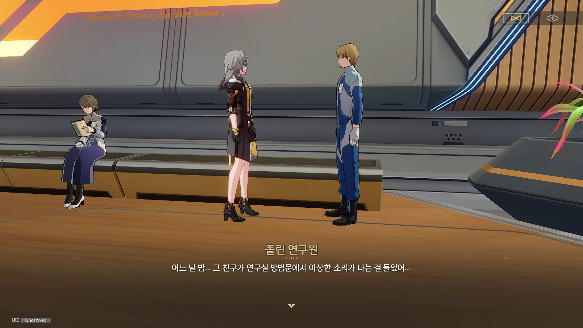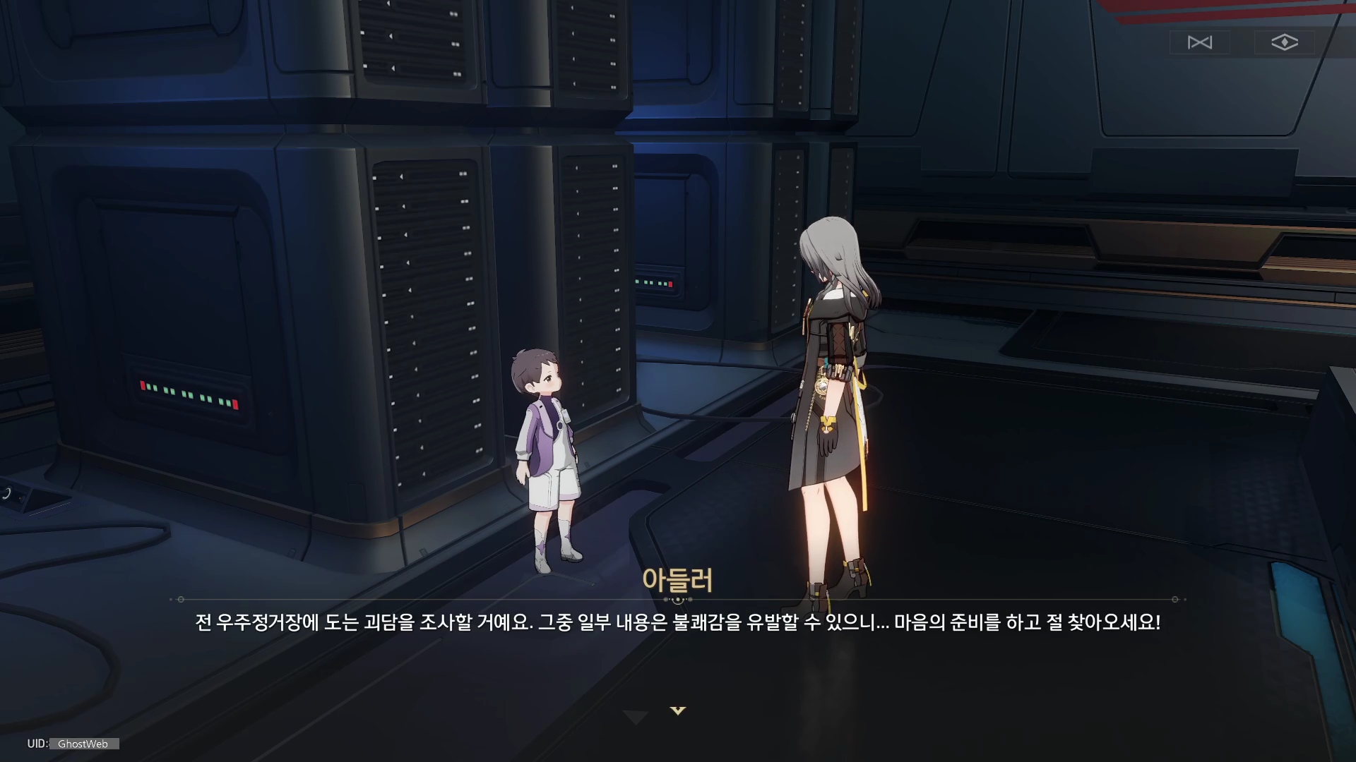 서포트 캐빈에서 아들러와 대화를 하면 우주정거장 괴담을 조사할 거라면서 보관 캐빈 2층으로 따라오라고 해요.