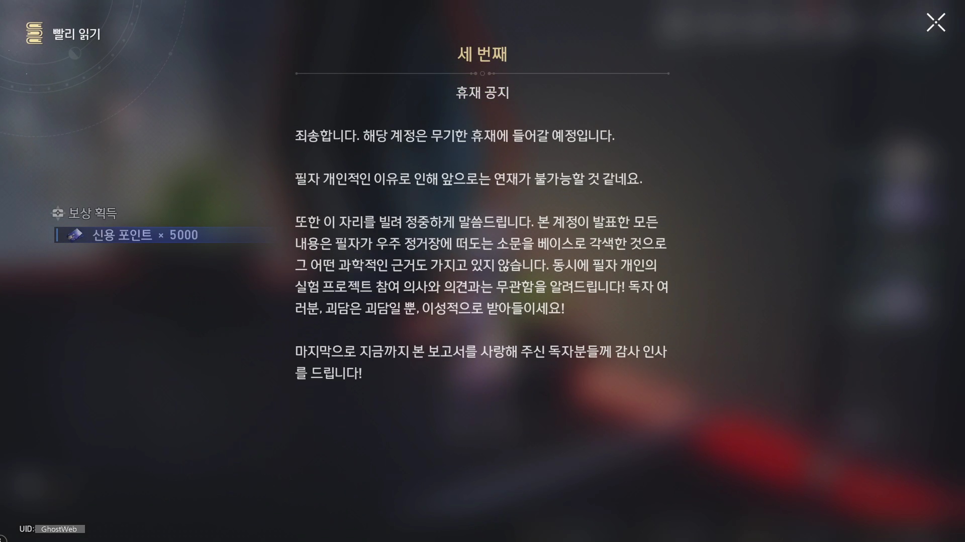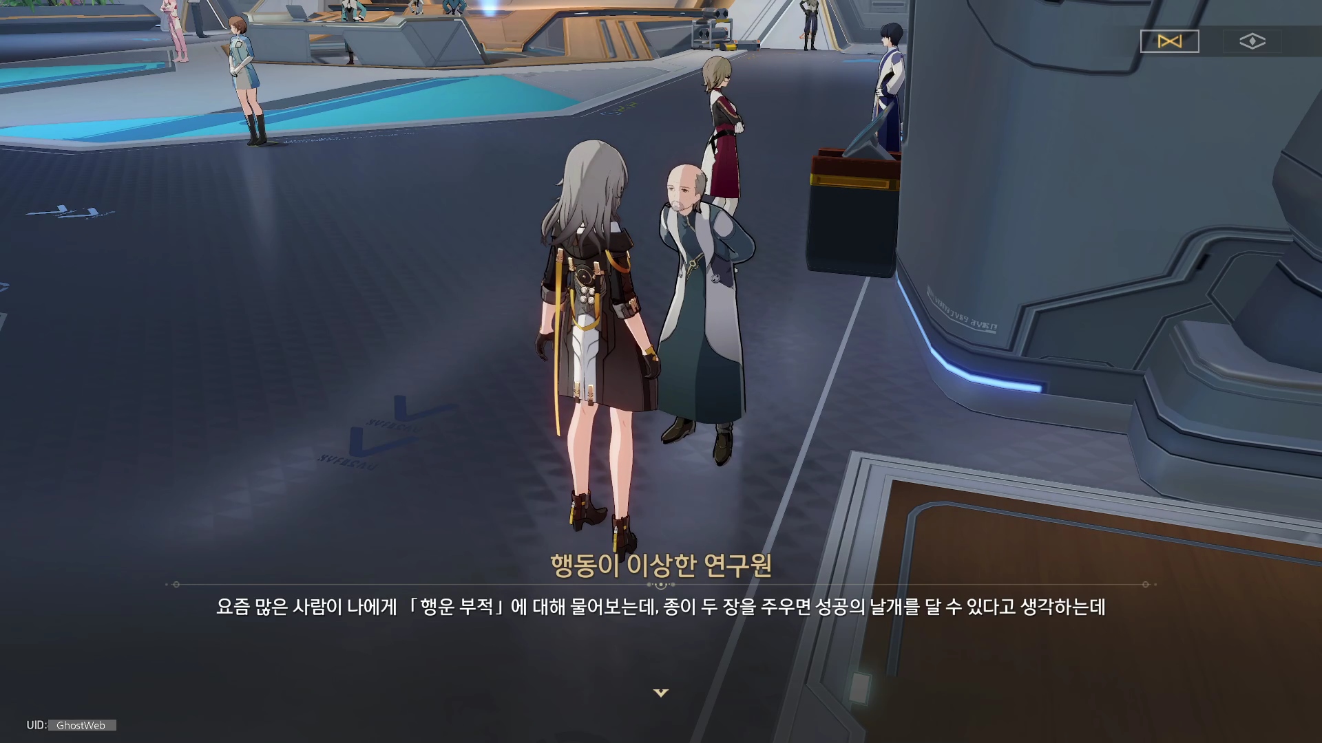 미니맵 기준 오른쪽 계단 벽쪽에 있는 [ 행동이 이상한 연구원 ]에게 말을 걸어 행운 부적에 대해 정보를 얻고 아들러에게 이를 알려주면 이 정도의 정보로는 연구 보고서를 쓸 수 없다며, 휴재 공지와 [ 아들러의 괴담 연구 보고 3 ]을 주고 임무가 완료돼요.