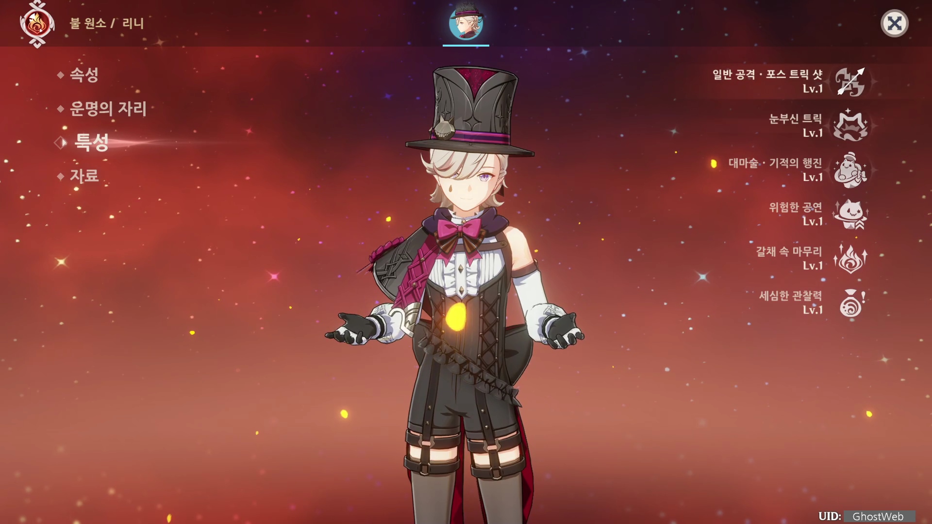 · 파티 내에 리니를 제외한 불 원소 타입의 캐릭터가 1명 존재할 때마다 해당 효과가 추가로 20% 증가한다.