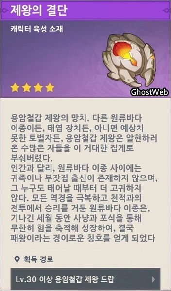 용암철갑 제왕을 처치하면 리니 육성 소재인 [ 제왕의 결단 ]와 성유물, 불 원소 캐릭터 돌파 소재인 불타오르는 마노를 획득할 수 있어요.