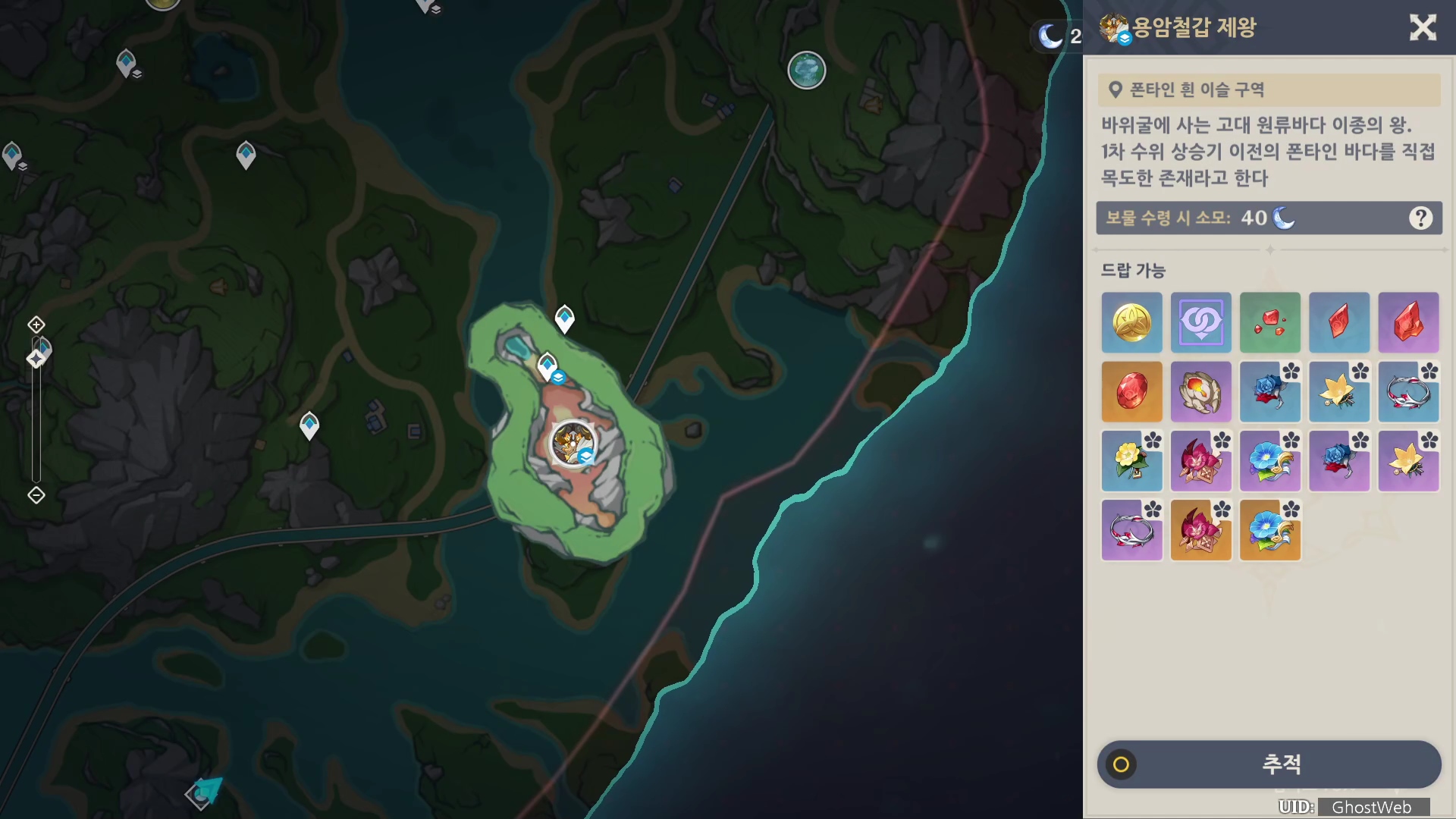 - 폰타인 지도에서 [ 오똔산 서쪽 ] 글자 대략 7시 방향에 바닷가에서 수중 터널로 들어가 지하 워프 포인트로 쪽으로 가면 용암철갑 제왕을 볼 수 있어요. (동굴 입구에 신의 눈동자 존재)