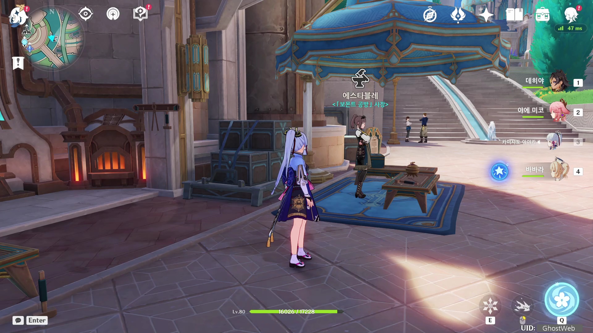 에스타블레는 폰타인 성 11시 방향에 있는 신의 석상으로 이동하여, 지도에서 오른쪽 방향으로 점프하여 아래로 내려가면 바로 만날 수 있어요.
