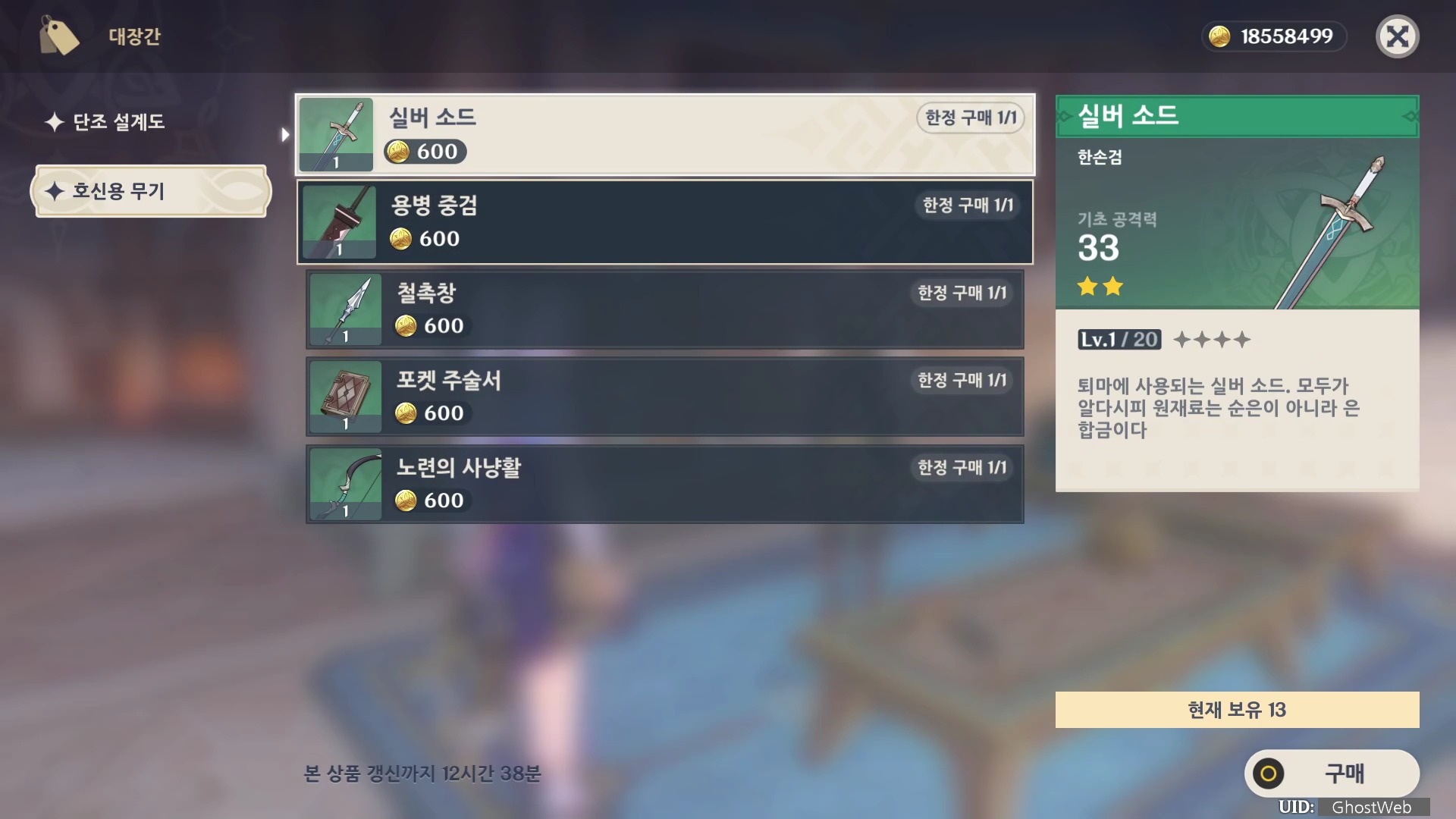 에스타블레는 신규 단조 무기 설계도를 얻어 배울 수 있는데, 구매는 폰타인 지역 필드에서 얻을 수 있는 풍선귤, 응축 결정, 돌말 등이 필요해요.