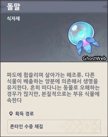 돌말은 폰타인 성에 있는 에스타블레 (폰타인 보몬트 공방 사장, 대장간)에게서 해연의 피날레의 무기 단조 설계도를 교환 받기 위한 재료 중에 하나에요. (풍선귤, 응축 결정도 필요)