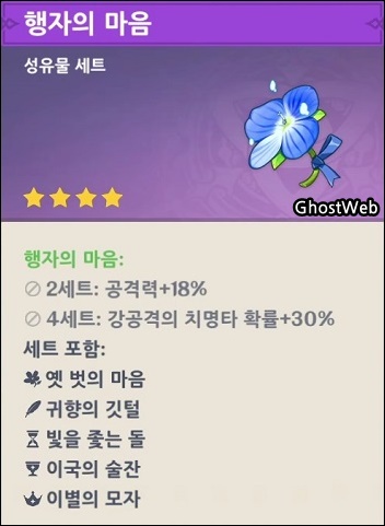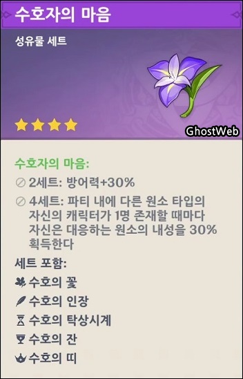 - 4세트 : 파티 내에 다른 원소 타입의 자신의 캐릭터가 1명 존재할 때마다 자신은 대응하는 원소의 내성을 30% 획득