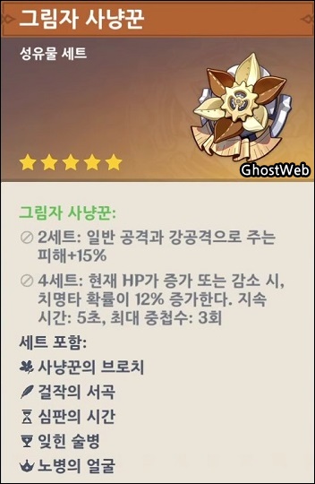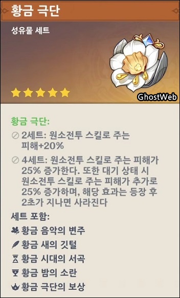 죄업의 종말 비경에서는 신규 성유물인 그림자 사냥꾼, 황금 극단을 얻을 수 있는데, 황금 극단의 경우 원소 전투 스킬로 주는 피해가 증가하여 원소 전투 스킬로 서포트 공격을 하는 캐릭터에게 알맞을 거 같네요. (예 : 피슬)