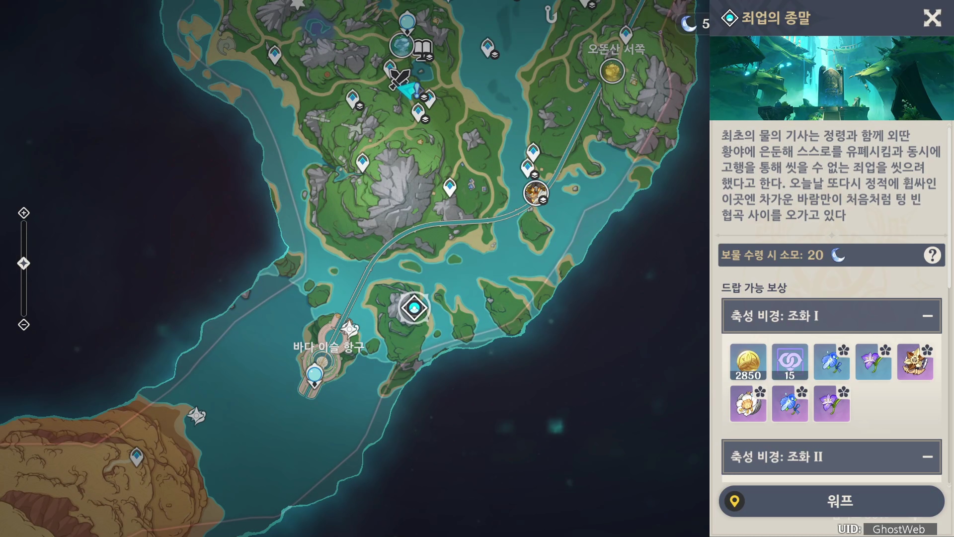 - 폰타인 시작 시작 지점인 바다 이술 항구에서 오른쪽 섬에서 죄업의 종말 비경을 발견할 수 있어요.