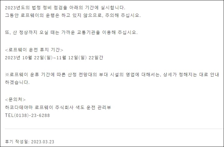 ※ 2023-10-22 ~ 2023-11-12 로프웨이 점검으로 운영을 하지 않는다고 하니 주의하세요.