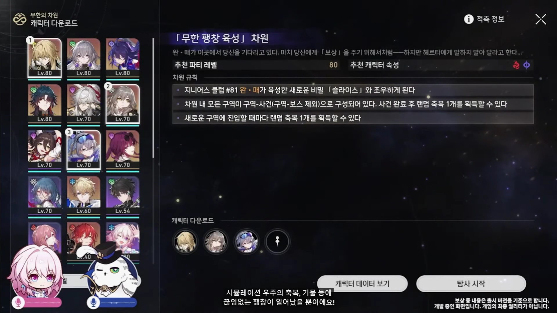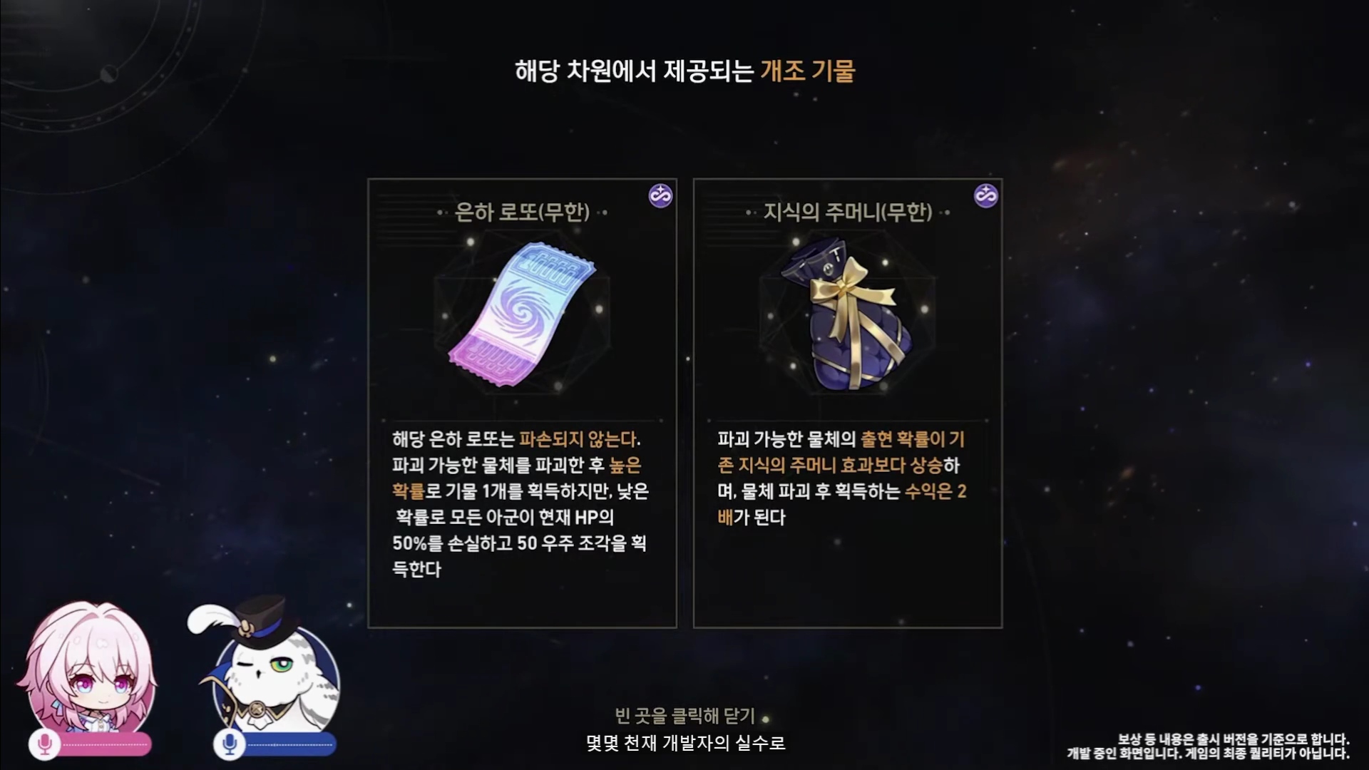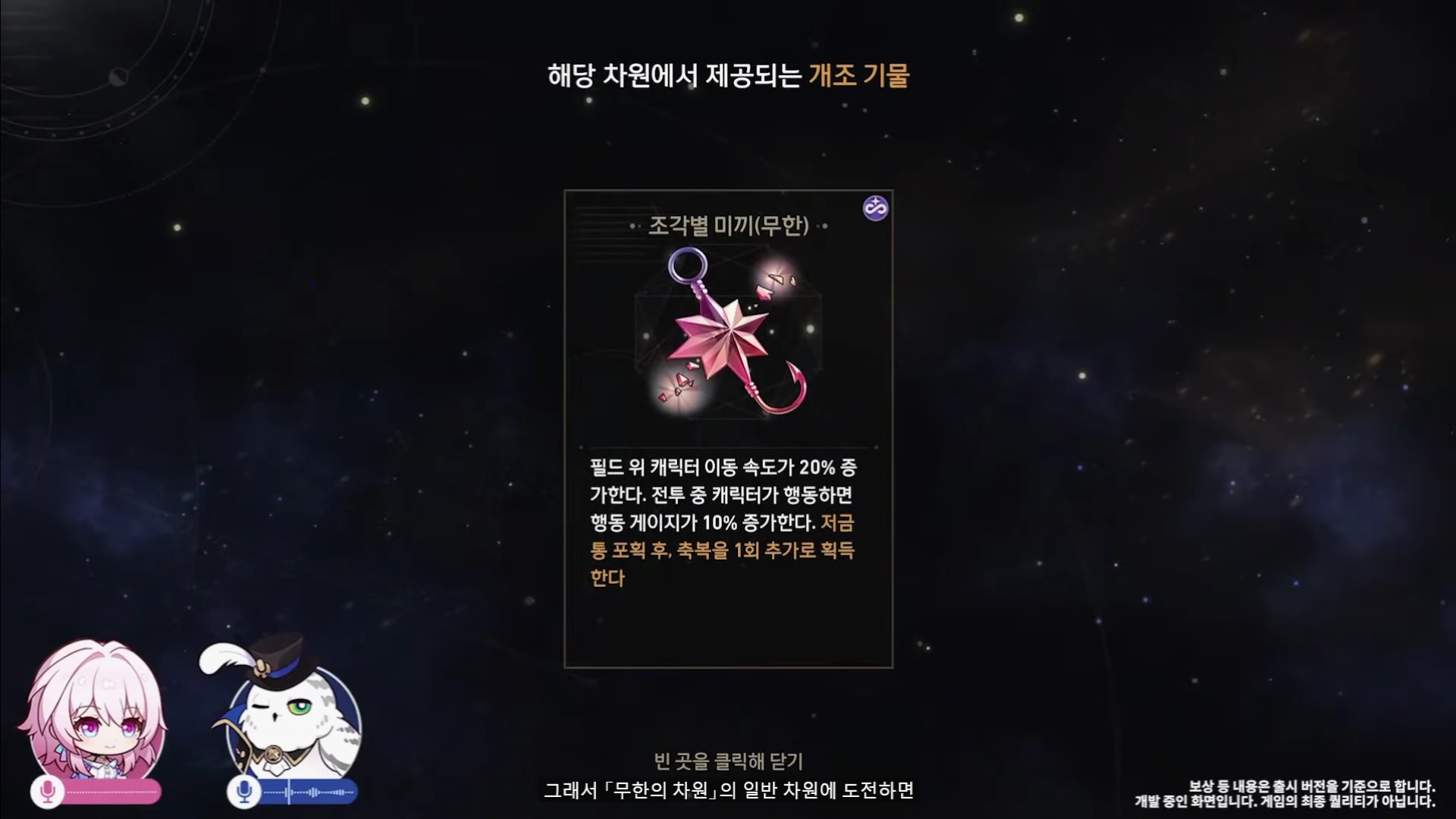 - 시뮬레이션 우주에서 승리하면 파티는 추가로 소량의 우주 조각을 획득하고 낮은 확률로 1개의 랜덤 기물을 획득할 수 있음