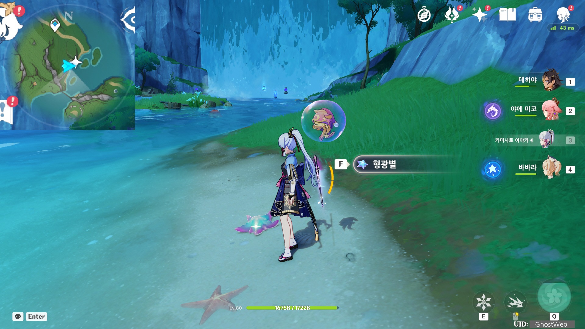 형광별은 해안가, 물 속에서 얻을 수 있으며, 특정 위치에 모여 있기보다는 해안가에 1~3개 정도가 쭉 널려있는 수준이에요.
