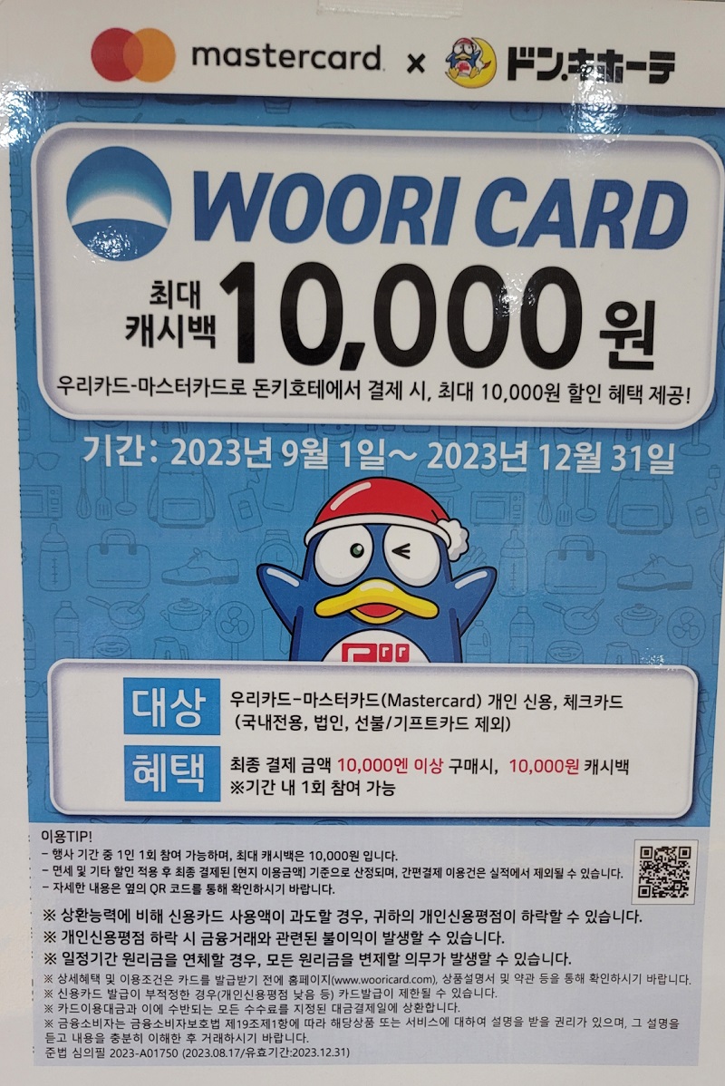 아래에 돈키호테에서 사용가능한 쿠폰 링크를 첨부하오니, 여행 시 해당 쿠폰을 사용해서 쇼핑을 하시고, 한국 카드사 이벤트도 확인하고 여행을 떠나세요. (10만엔 이상 사용 시 10% 할인, 일본 전국 돈키호테에서 사용 가능)