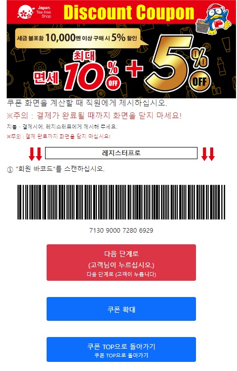운영 시간은 10 ~ 23시이고 할인 쿠폰의 경우 5만엔 이상 시 5% 할인 쿠폰을 사용할 수 있으며, 할인 쿠폰은 아래의 링크를 통해 결제 시 해당 바코드를 점원에게 보여주면 돼요.