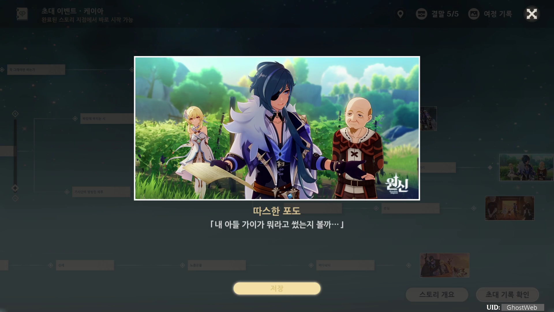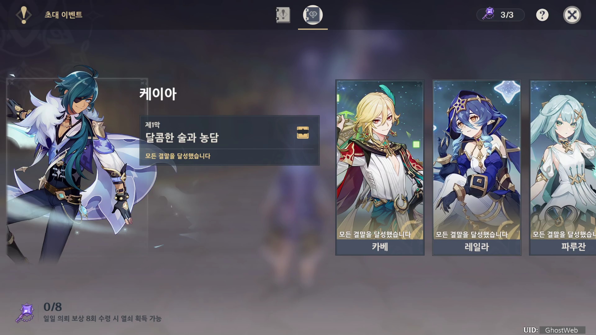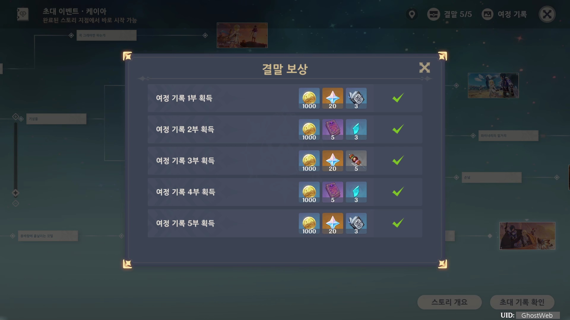 케이아 초대 이벤트 [제1막 - 달콤함 술과 농담]은 총 5개의 여정 기록(엔딩)으로 나눠져 있으며, 각 엔딩을 볼 때마다 원석, 경험치 책 등의 보상을 얻을 수 있어요.