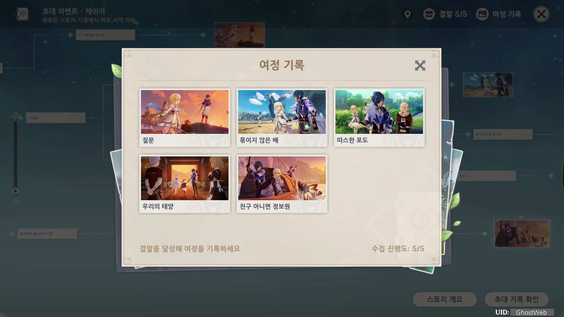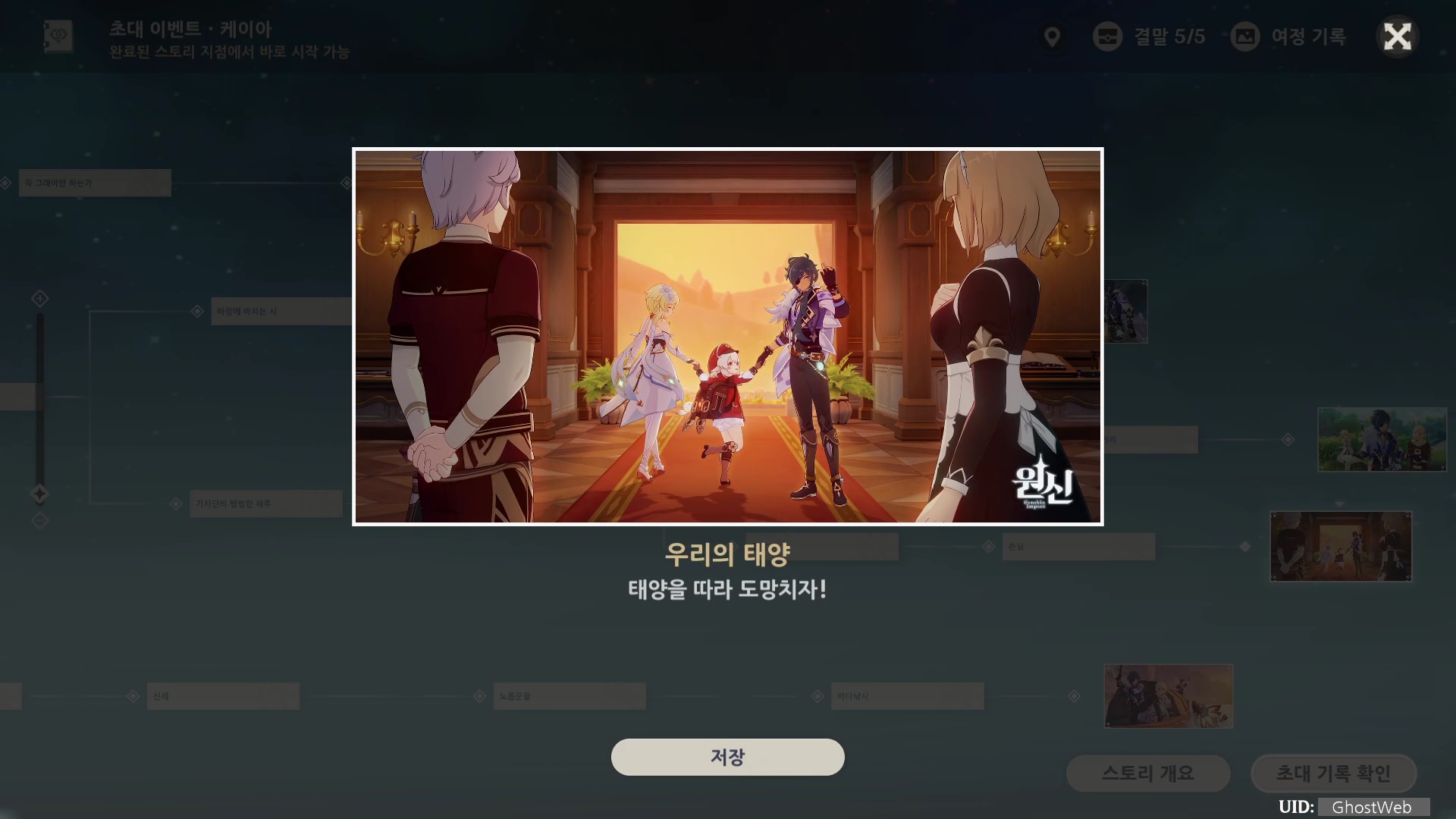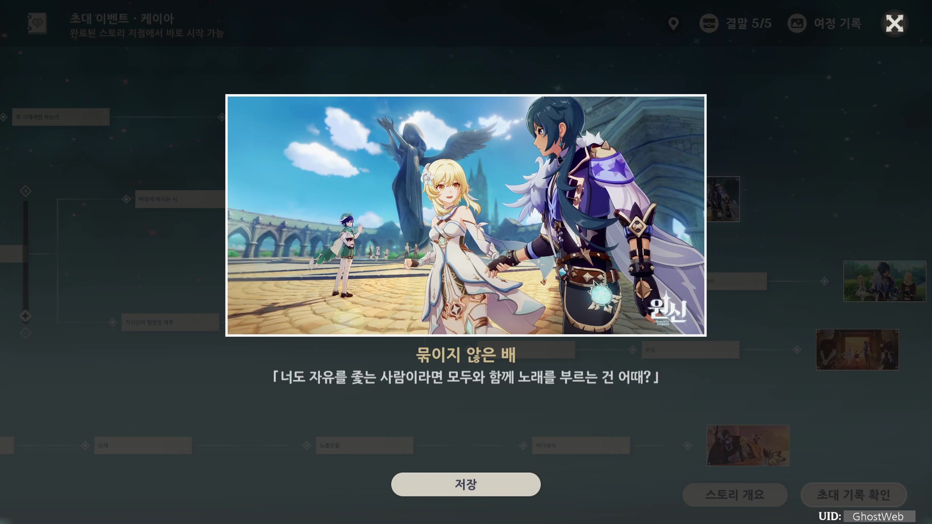 케이아 초대 이벤트 [제1막 - 달콤함 술과 농담]은 총 5개의 여정 기록(엔딩)으로 나눠져 있으며, 각 엔딩을 볼 때마다 원석, 경험치 책 등의 보상을 얻을 수 있어요.