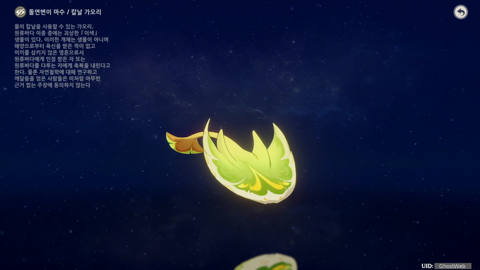 주요 사용처로는 느비예트의 돌파, 특성 소재로 쓰이는데 개체 수는 많으나, 많은 양을 드랍하지 않기 때문에 필드 탐험 시 종종 이상 원류 바다 이종을 처치하여 재료를 모아두는 편이 좋아요.