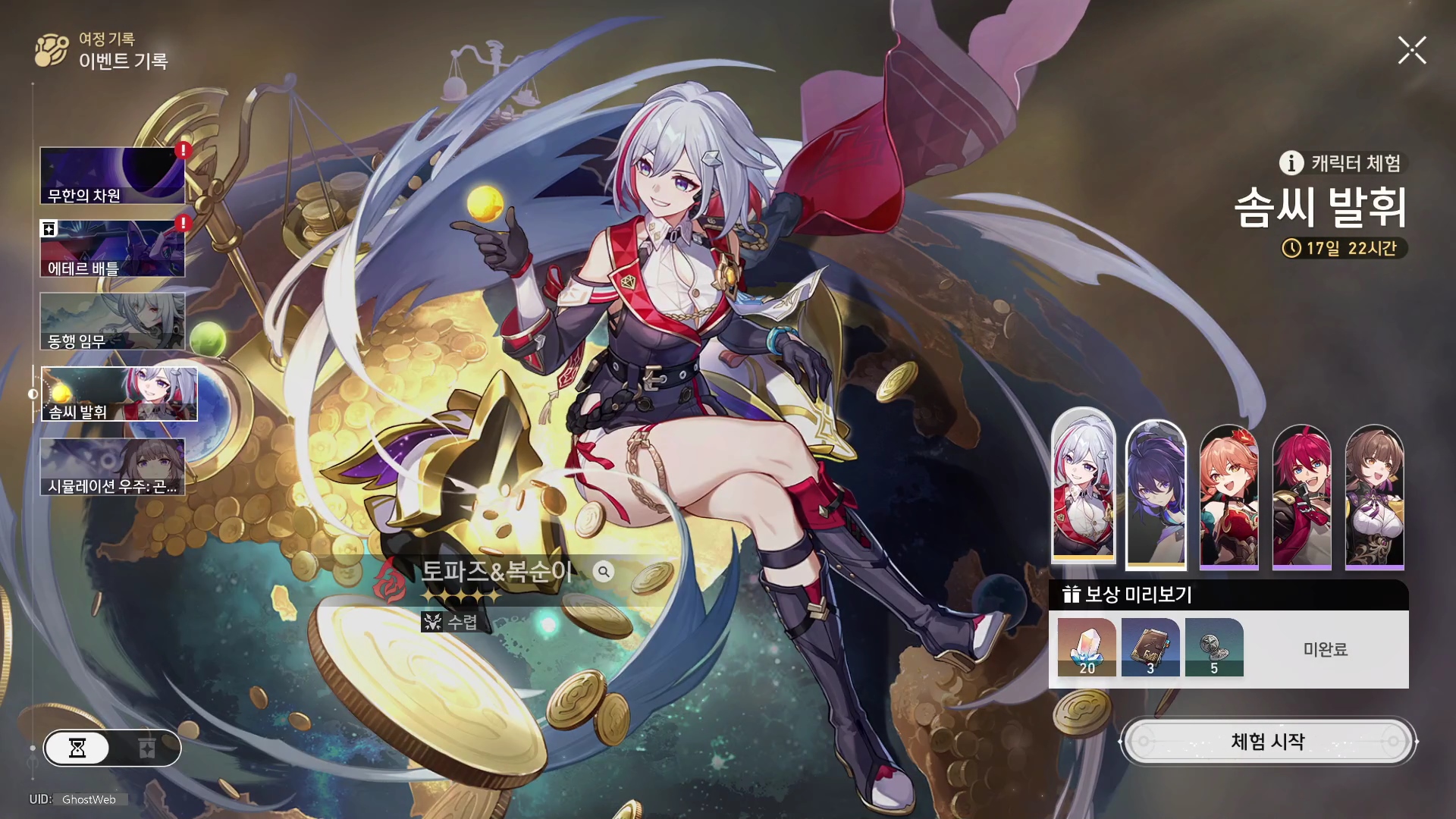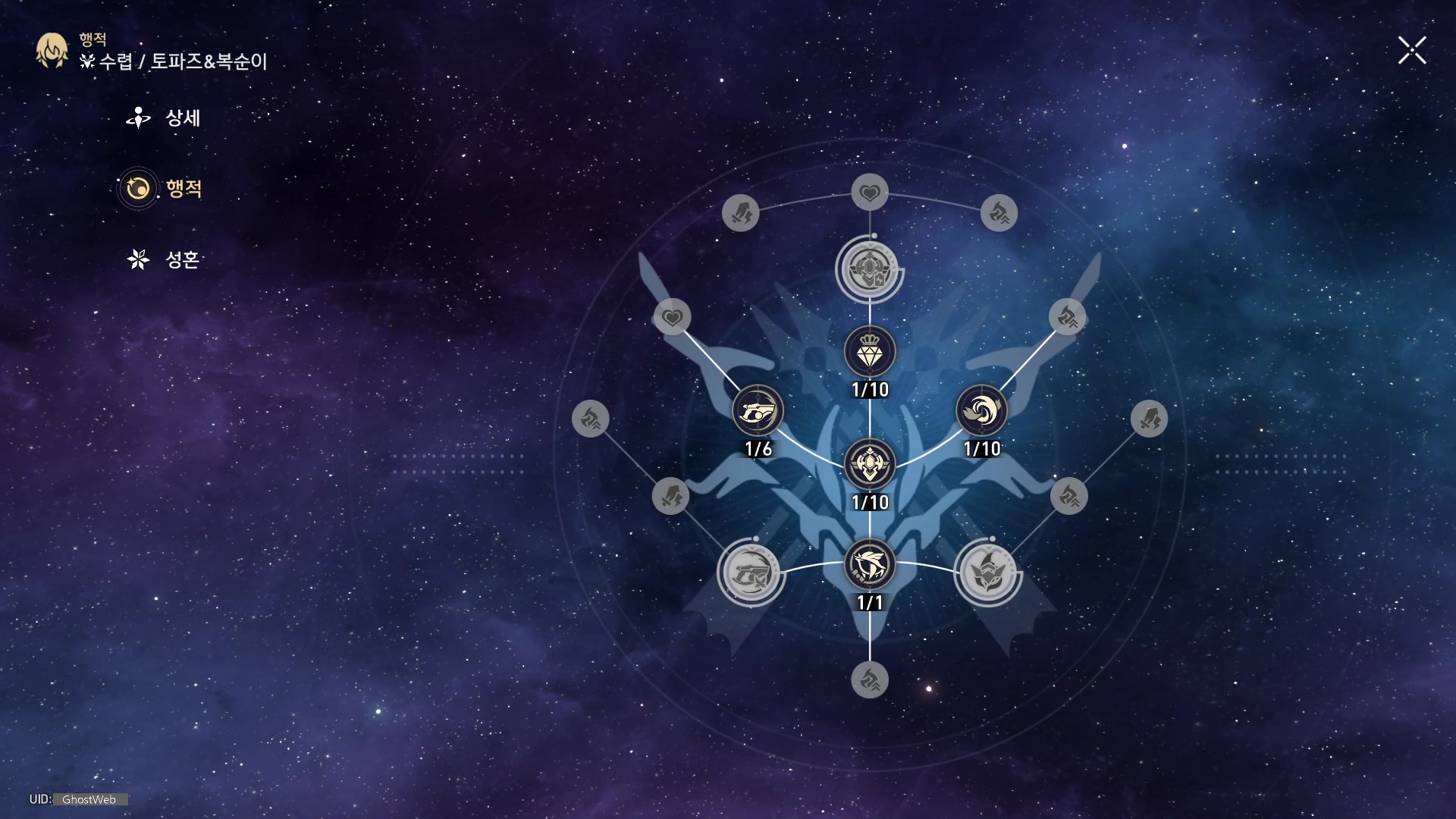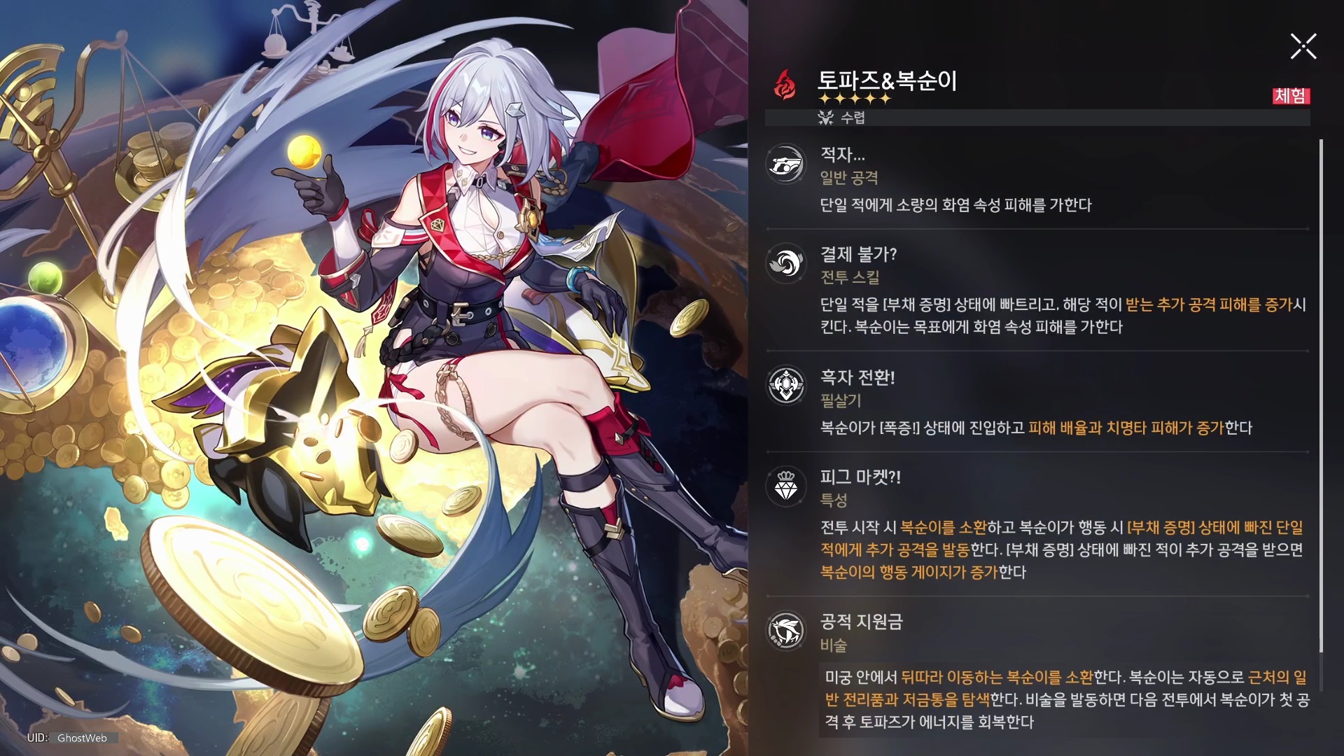 - 강화 - 토파즈는 필드 입장 시 복순이를 소환하고, 복순이는 일정 범위 내에 일반 전리품과 저금통을 자동으로 탐색한다. - 비술을 직접 발동하면 다음 전투에서 복순이가 첫 공격 발동 후 토파즈가 에너지를 60pt 회복한다. - 비술을 발동하고 맵에서 적과 전투하여 승리한 후, 토파즈가 여전히 파티에 있으면 신용 포인트 획득 단계에서 추가로 소량의 신용 포인트를 획득한다. - 신용 포인트는 하루에 최대 추가로 10,000 포인트 획득할 수 있다. - 비술을 발동하고 시뮬레이션 우주에서 적과 전투하여 승리하면 추가로 소량의 우주 조각을 획득하고 낮은 확률로 랜덤 기물을 1개 획득한다. |