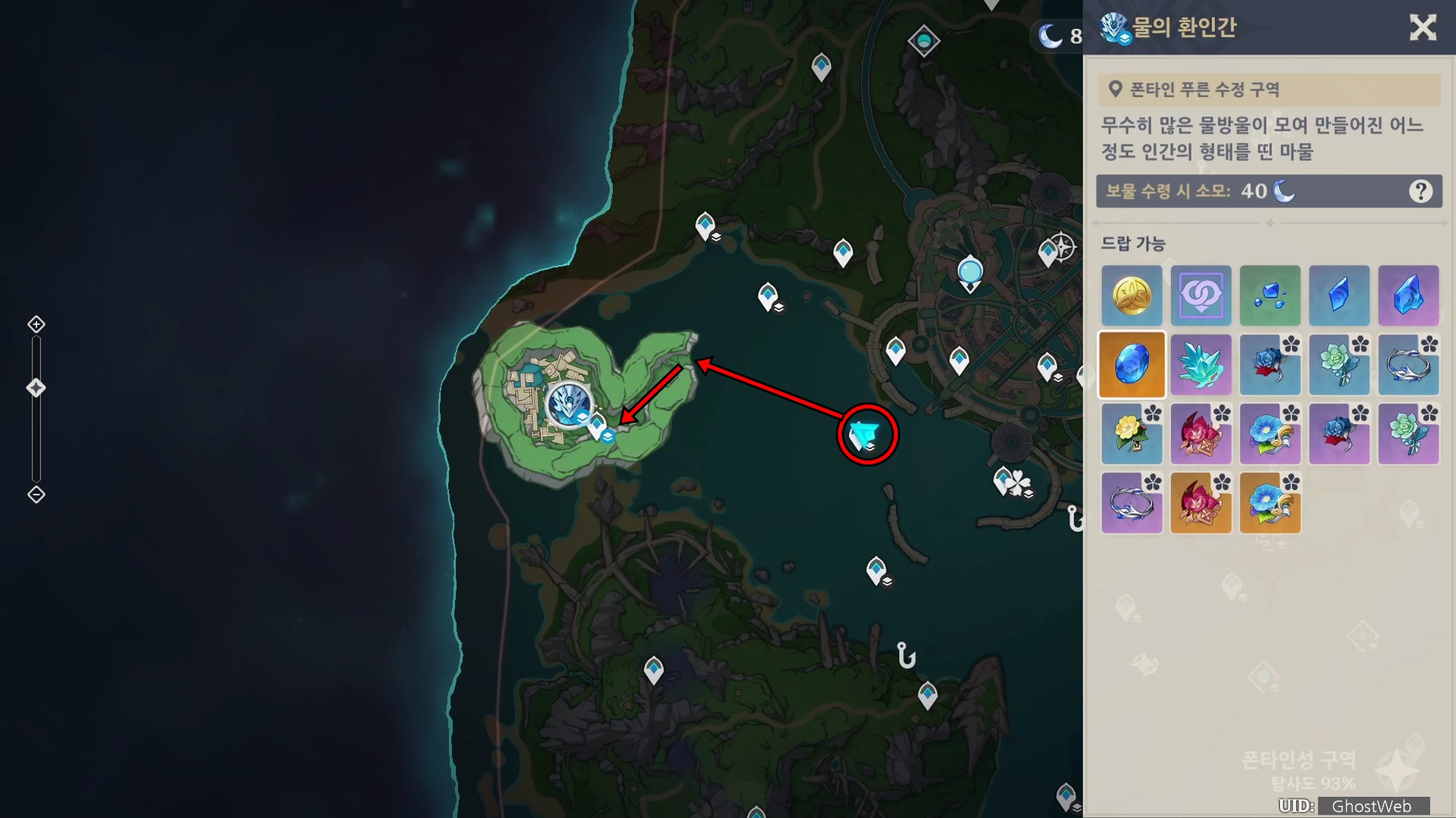 물의 환인간은 폰타인 성 기준 9시 방향 바다 속 동굴에 위치하고 있어요.