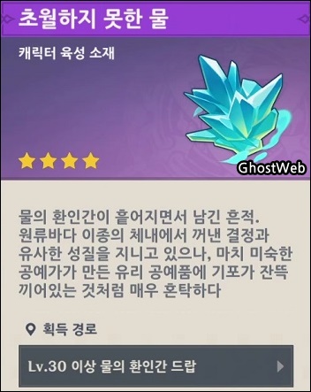 물의 환인간을 처치하면 푸리나의 돌파 소재인 초월하지 못한 물과 청금석 그리고 성유물 등을 보상으로 얻을 수 있어요.