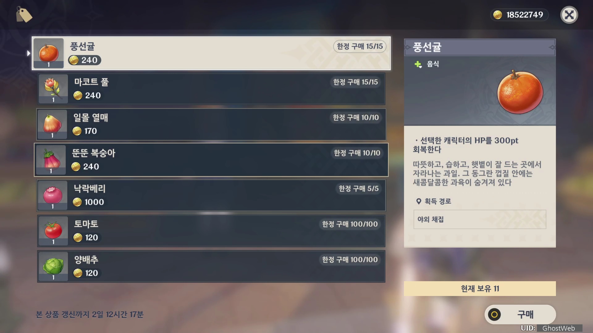 아루에 (카페 뤼테스 주인) 근처에 과일 가게 주인 외젠이 있는데, 풍선귤, 마코트 풀 등 다양한 식자재를 구매할 수 있어요.