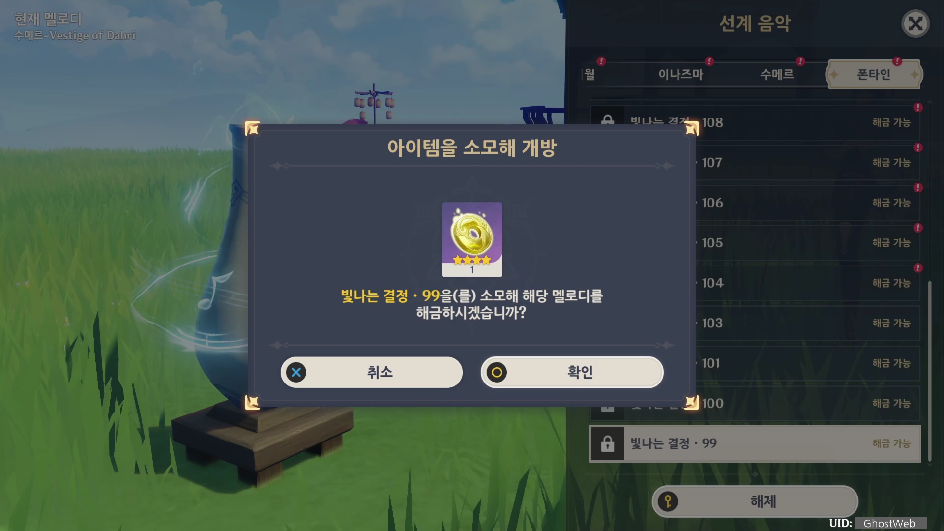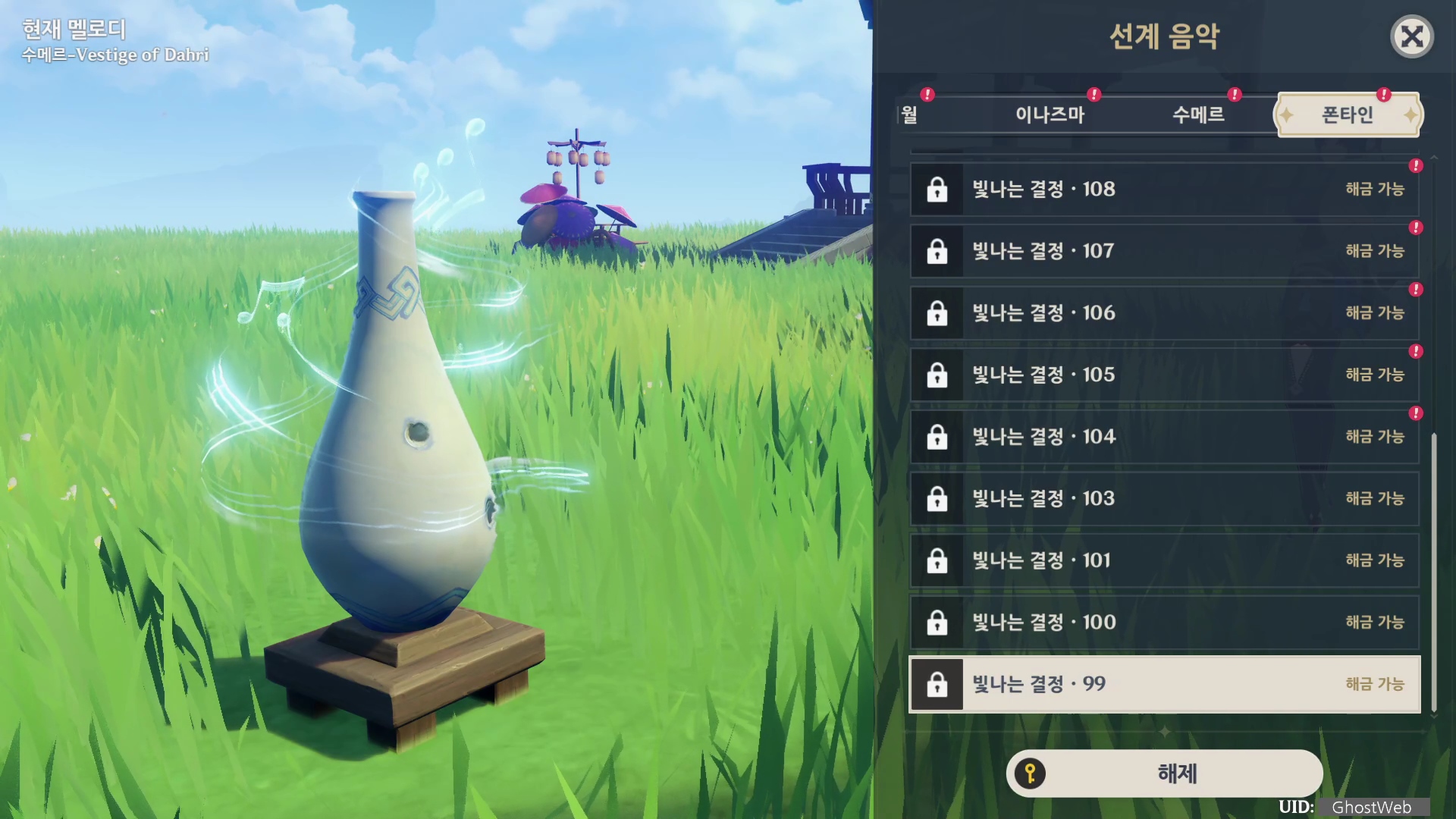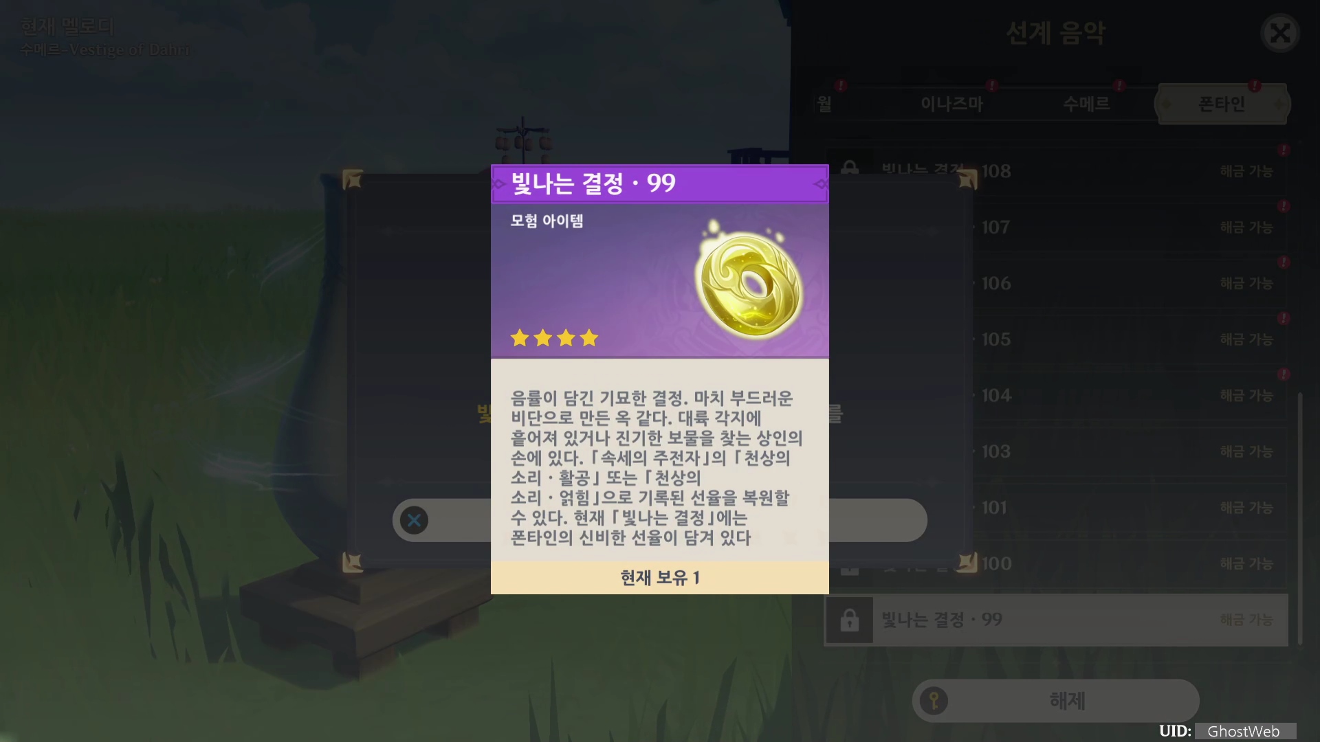 빛나는 결정은 속세의 주전자에서 선계 음악을 통해 필드 탐험에서 얻은 빛나는 결정을 해금하고 속세의 주전자 배경 음악으로 변경할 수 있어요.