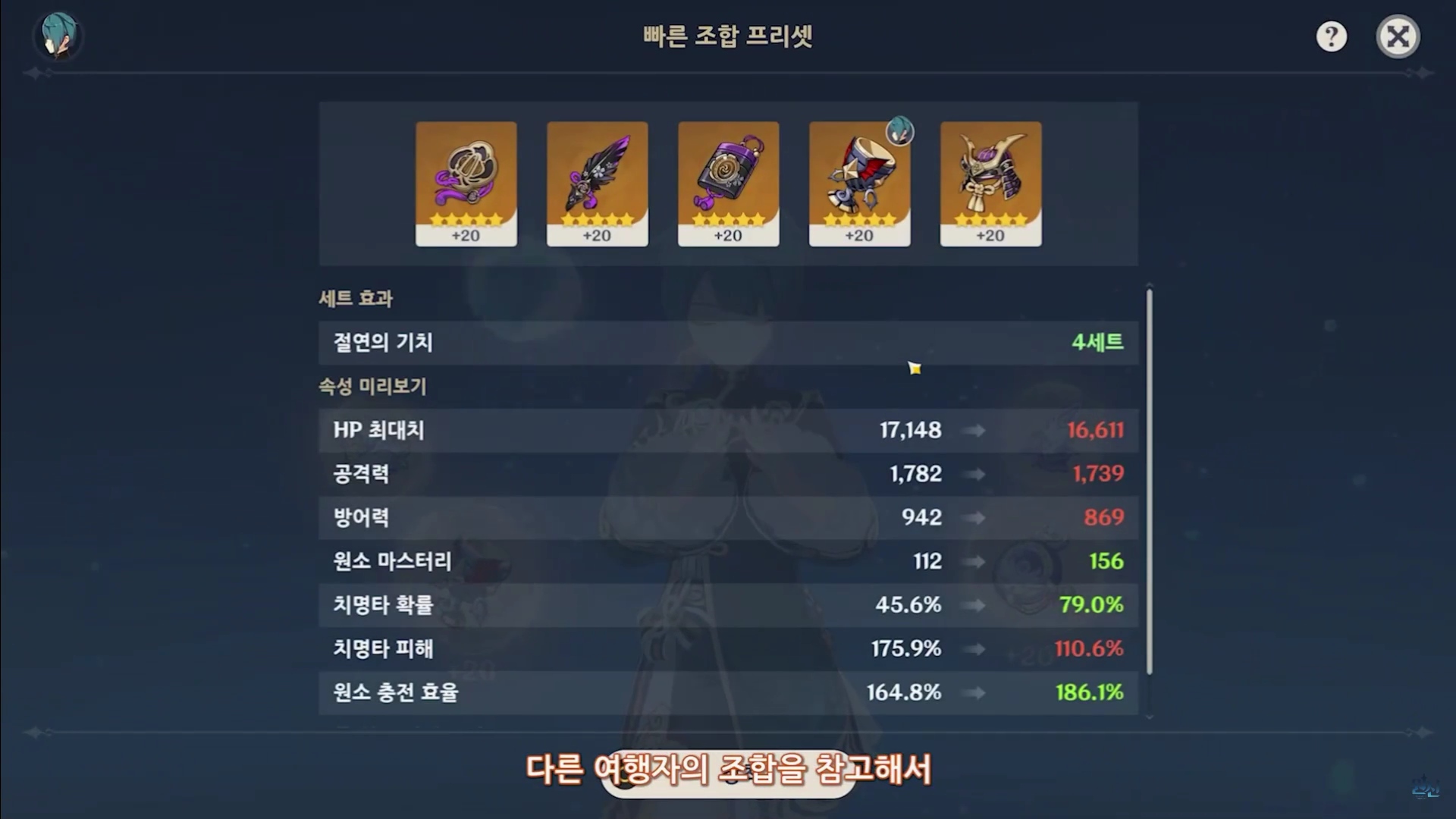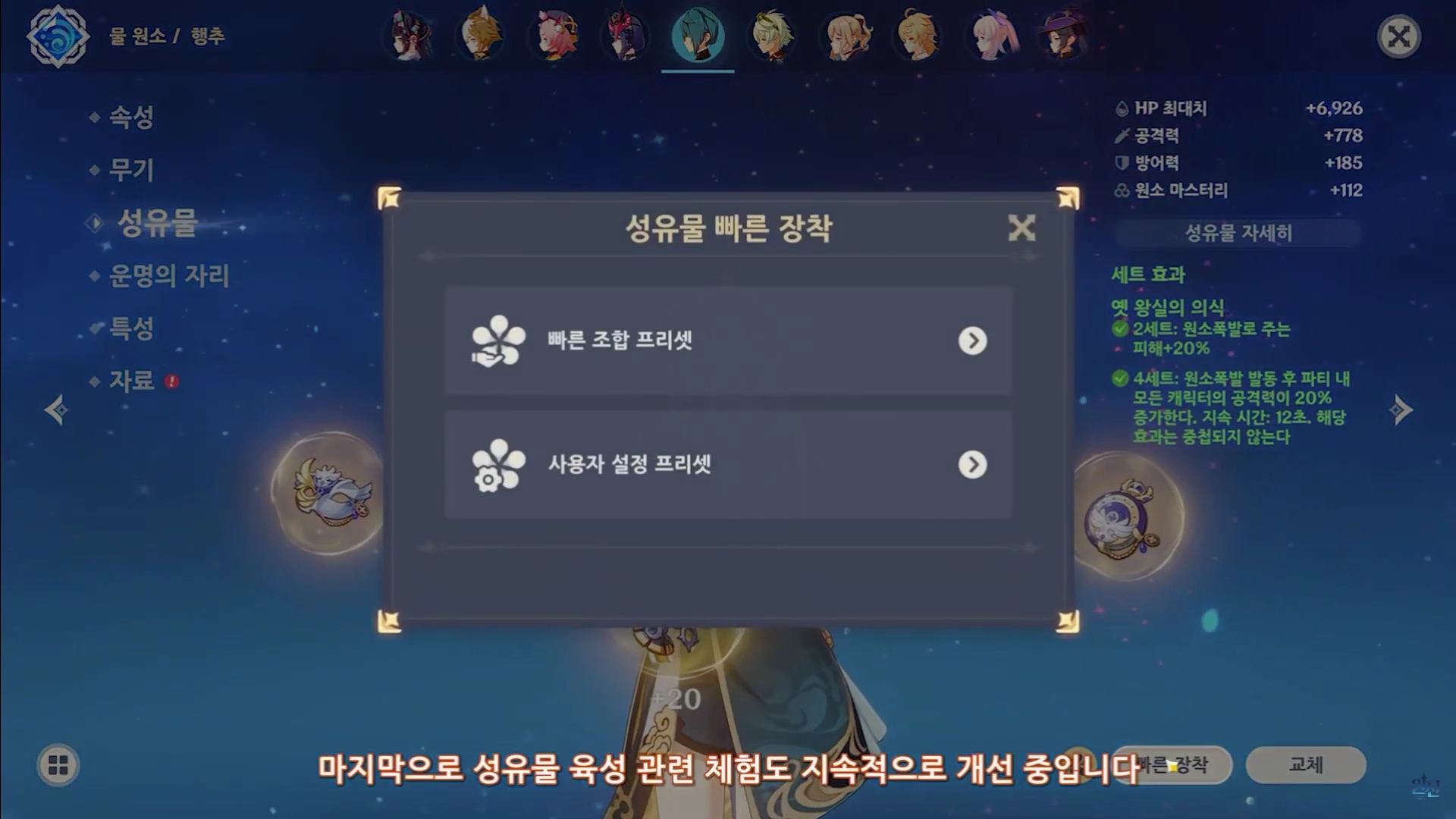 - 사용자 설정 기능 사용 또는 다른 플레이어의 조합을 참고하여 성유물 장착 가능