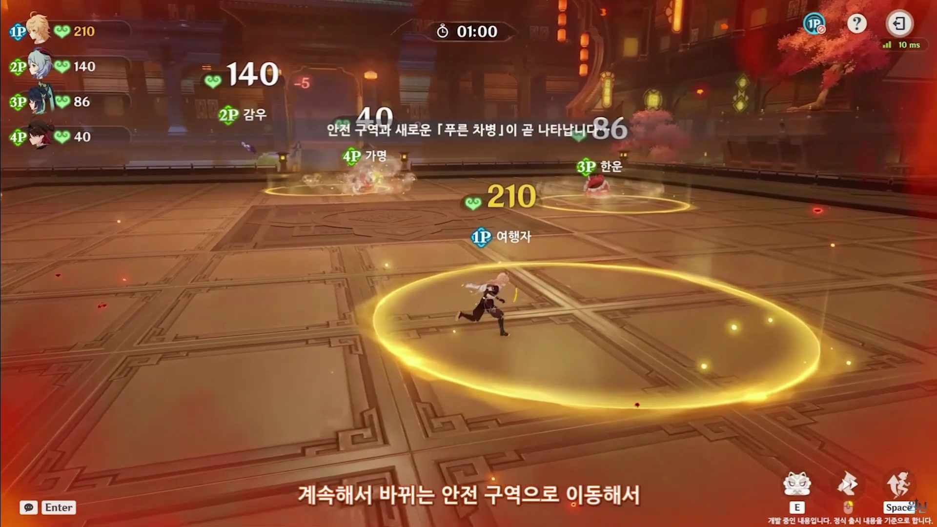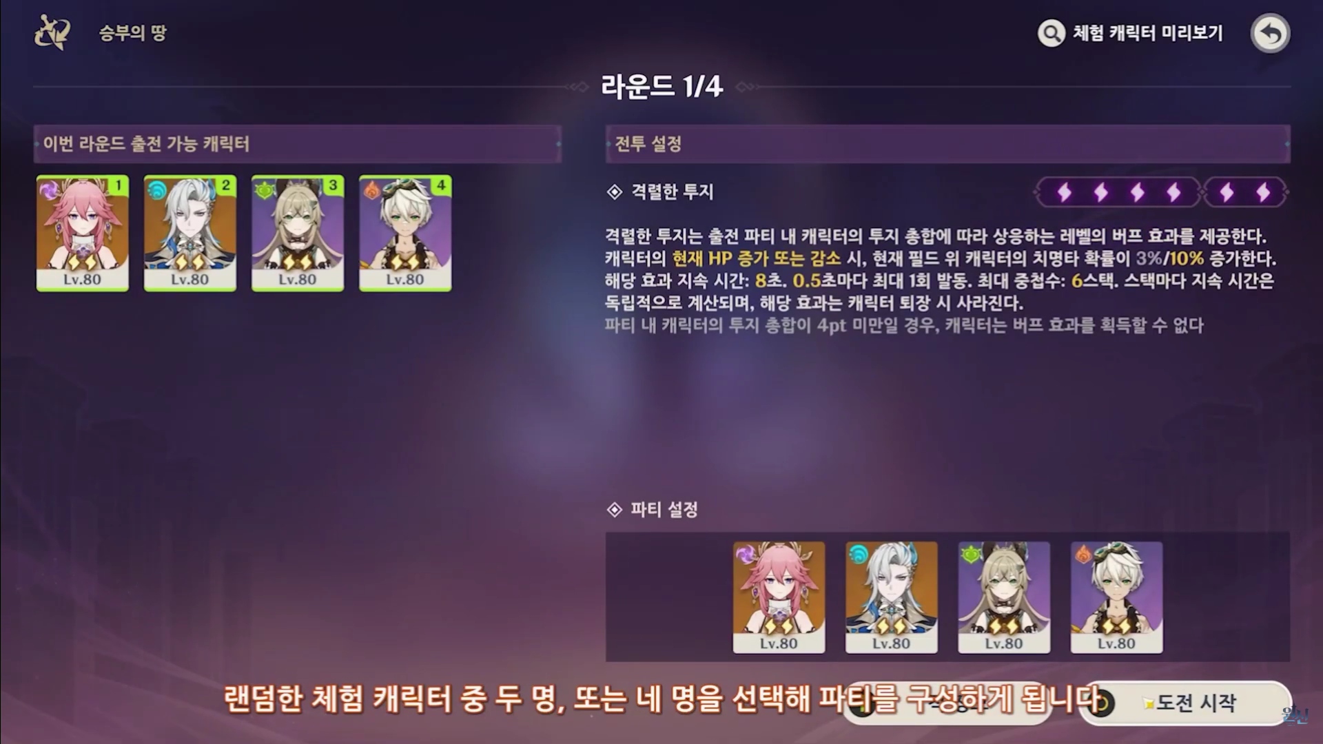 - 매 라운드마다 체험 캐릭터 2명이 지원되고 4명 파티를 구성하여 제한 시간 내에 적 처치하기