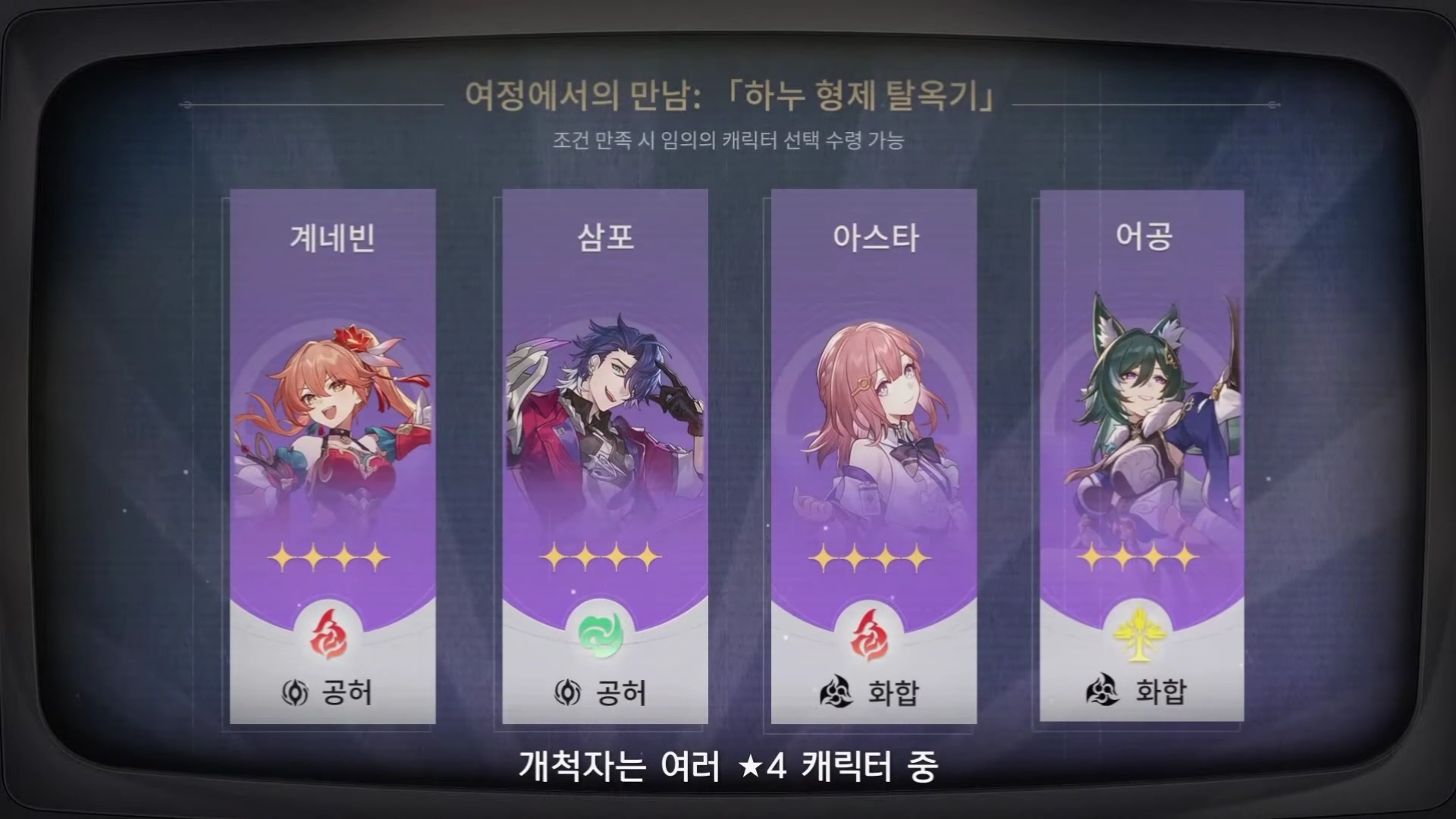 - 이벤트 진행 후 계네빈, 삼포, 아스타, 어공 중 1개 캐릭터 수령 가능