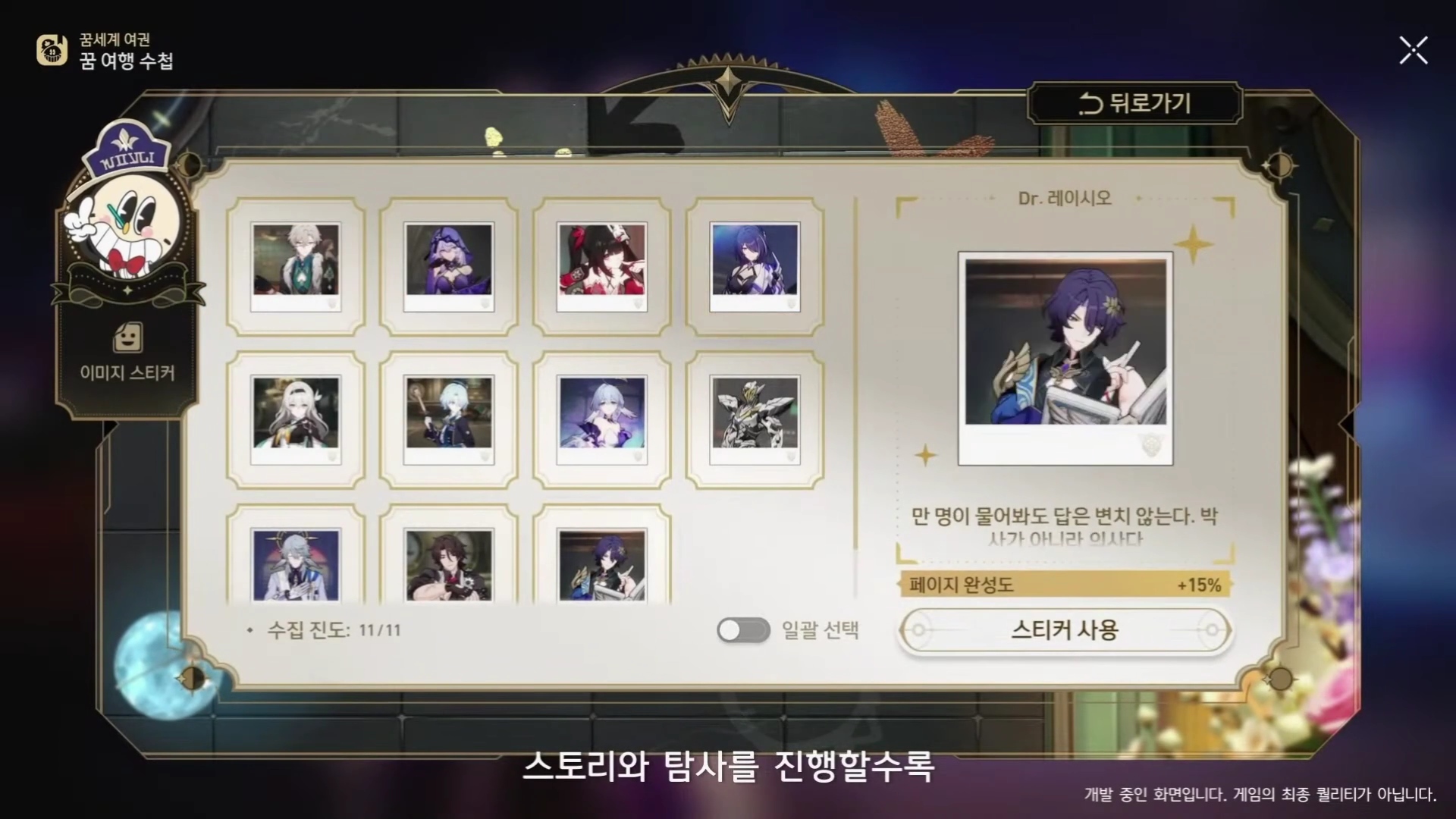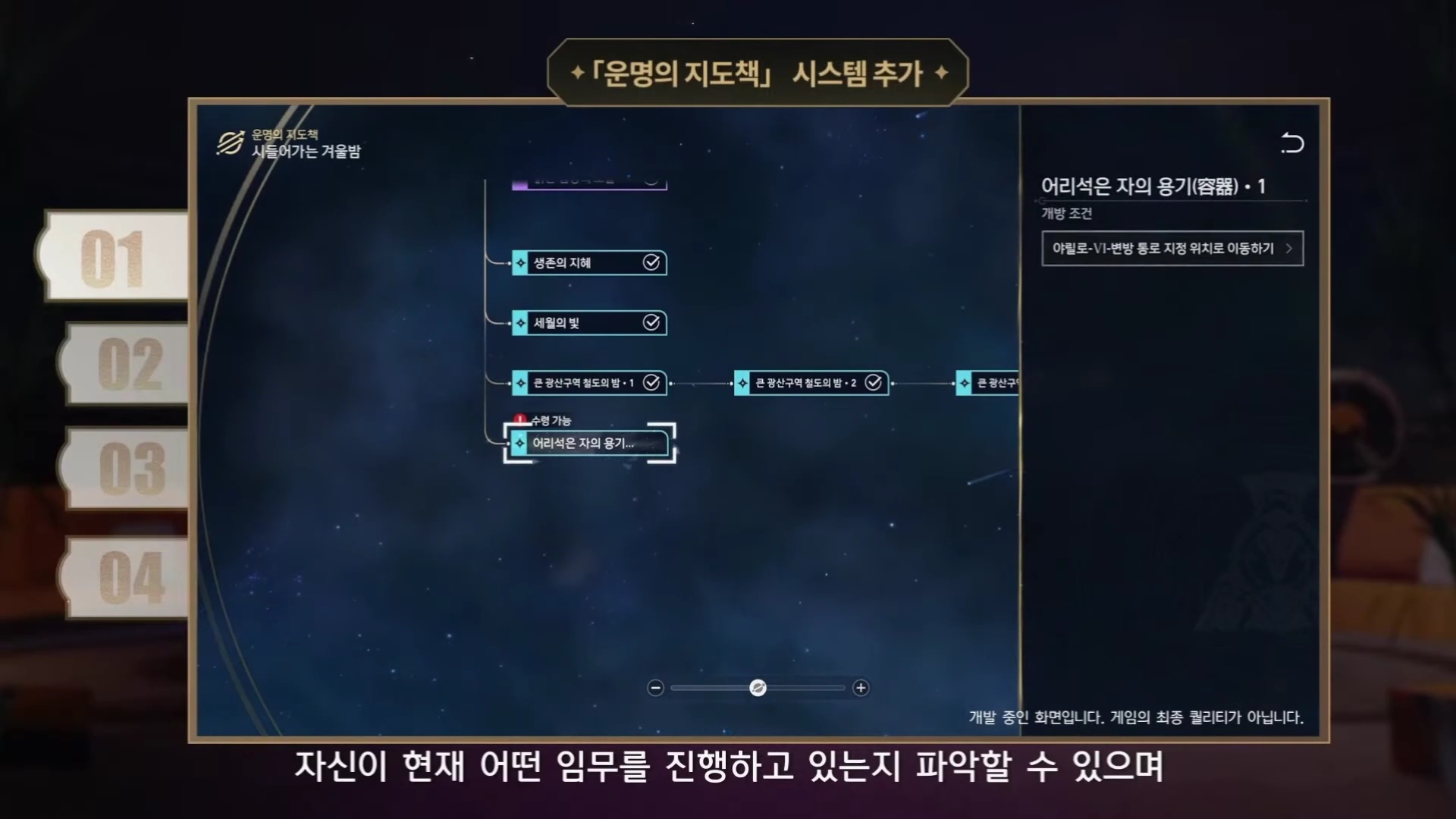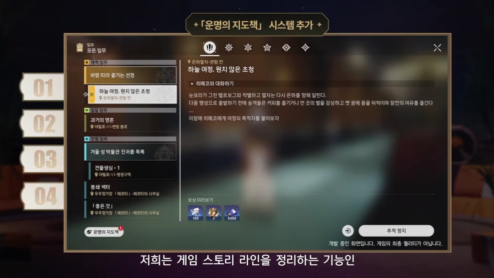 - 게임 스토리 라인을 볼 수 있음 (개척 임무, 모험 임무 등)