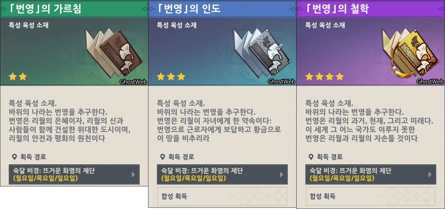- 해당 효과는 비경, 영역 토벌, 나선 비경에서 적용되지 않으며, 같은 효과의 고유 특성과 중첩되지 않는다.