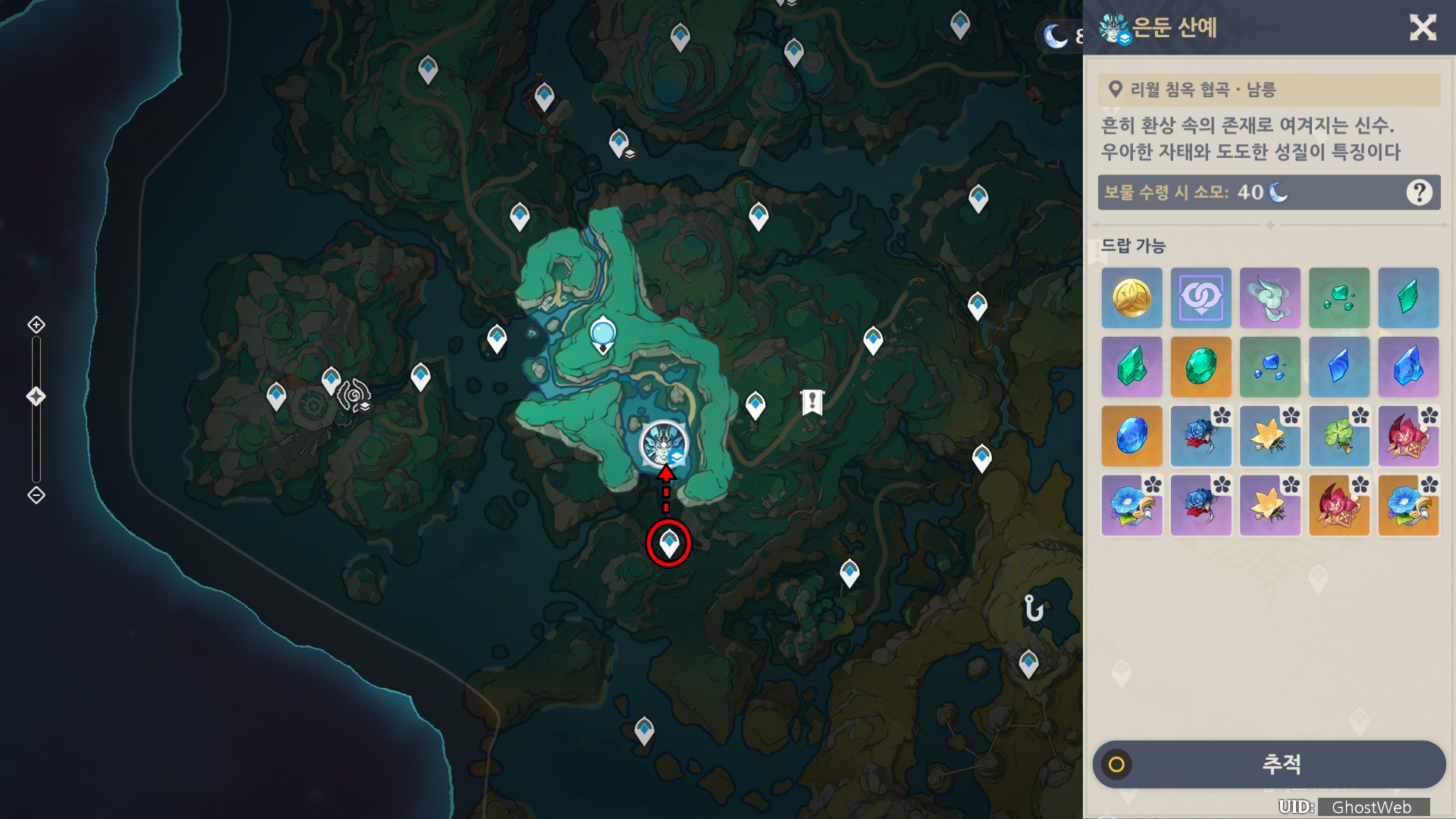 은둔 산예는 리월 침옥 협곡 적장 성벽 아래 동굴에 있어 근처 워프 포인트를 통해 쉽게 접근할 수 있어요.