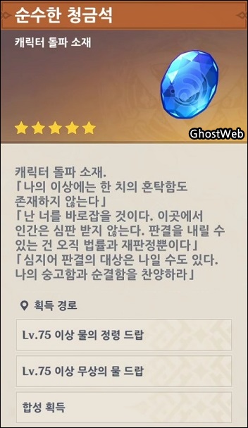 - 물 원소 : 순수한 청금석 가루, 순구한 청금석 조각, 순수한 청금석 덩이, 순수한 청금석