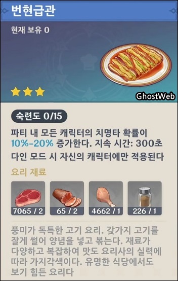 - 재료 : 짐승고기 2, 햄 2, 새고기 1, 후추 1