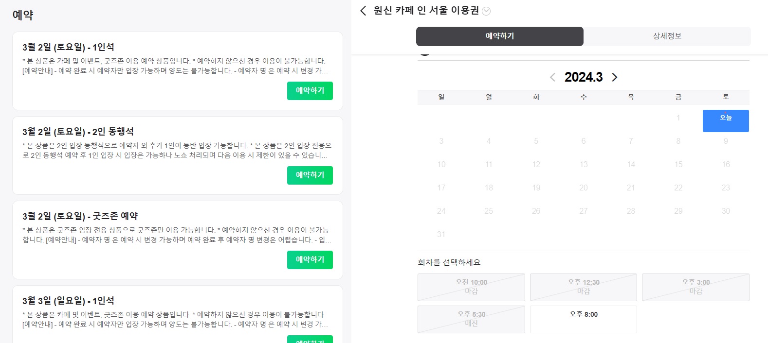 | 예약 가능 시간 | 10:00, 12:30, 15:00, 17:30, 20:00 | 11:00, 13:30, 16:00. 18:30. 21:00 |