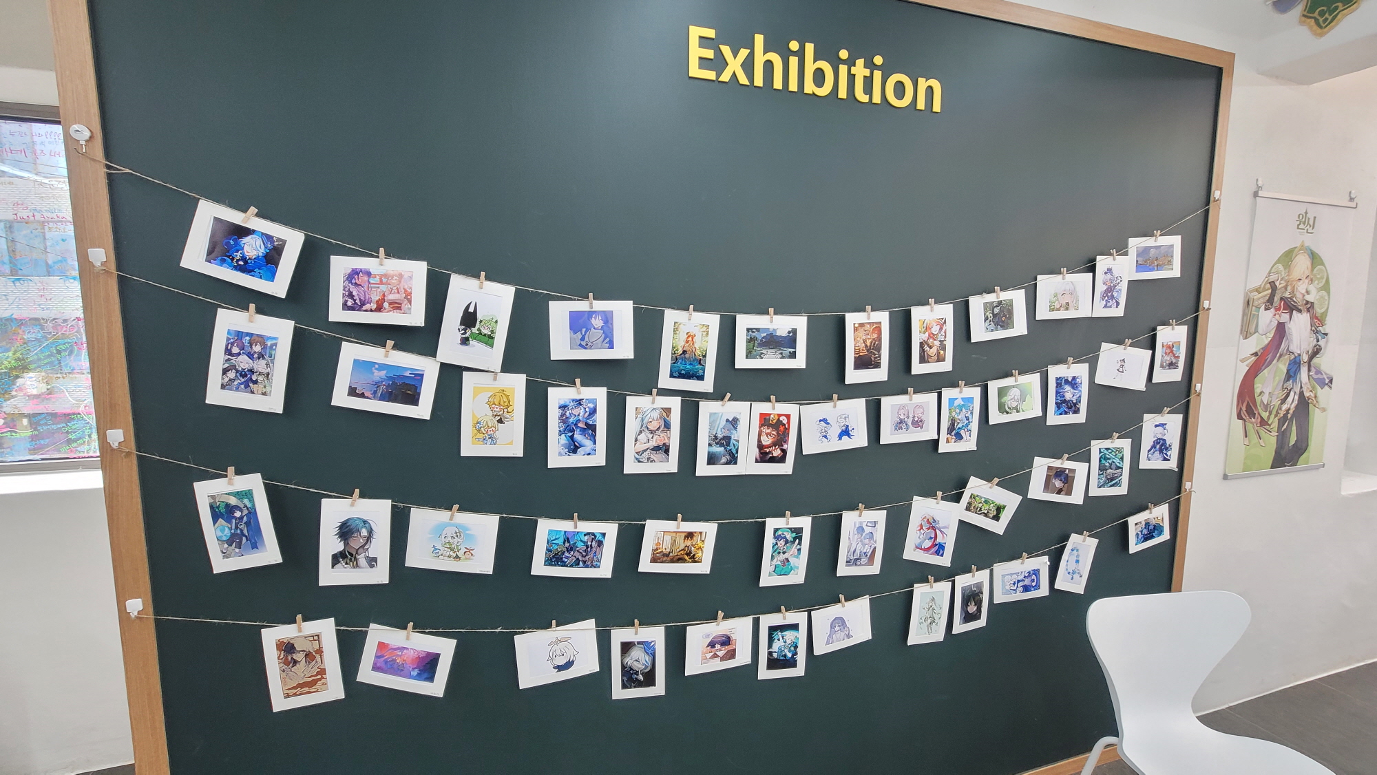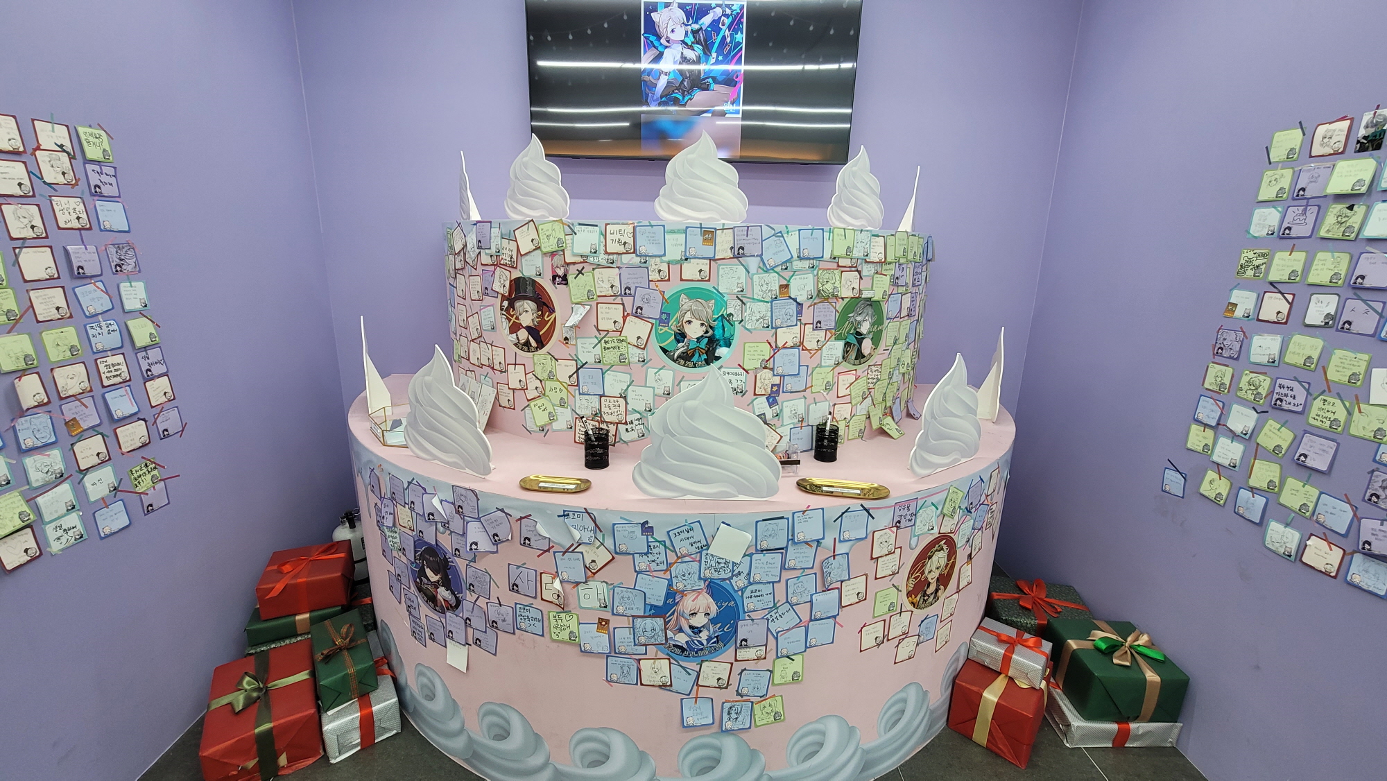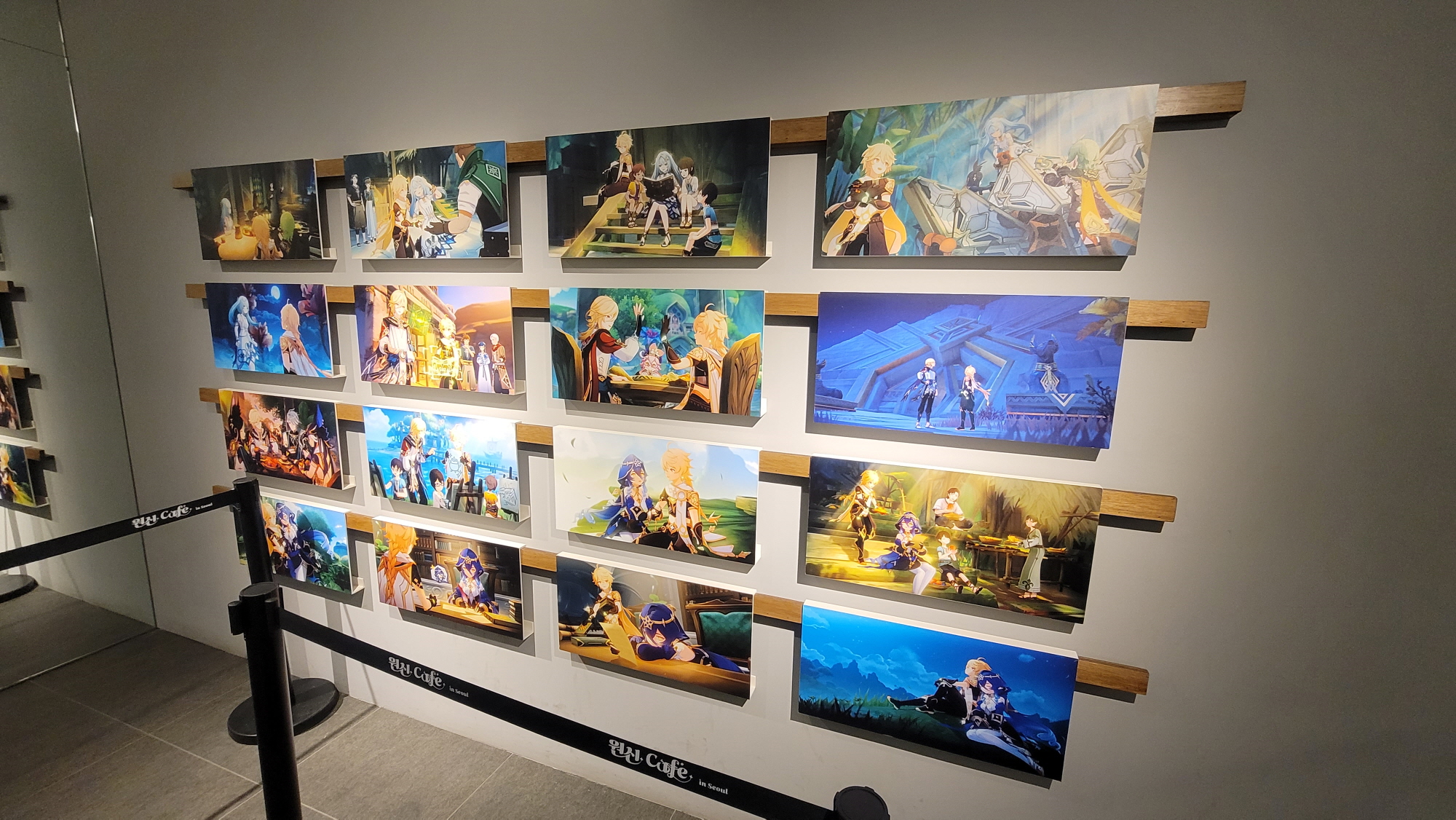 각 층 사이 벽에는 일러스트가 출력되어 있으며, 2~3층에는 캐릭터 일러스트, 팬아트와 코스어 분들의 기념 사진 등으로 꾸며져 있어요.