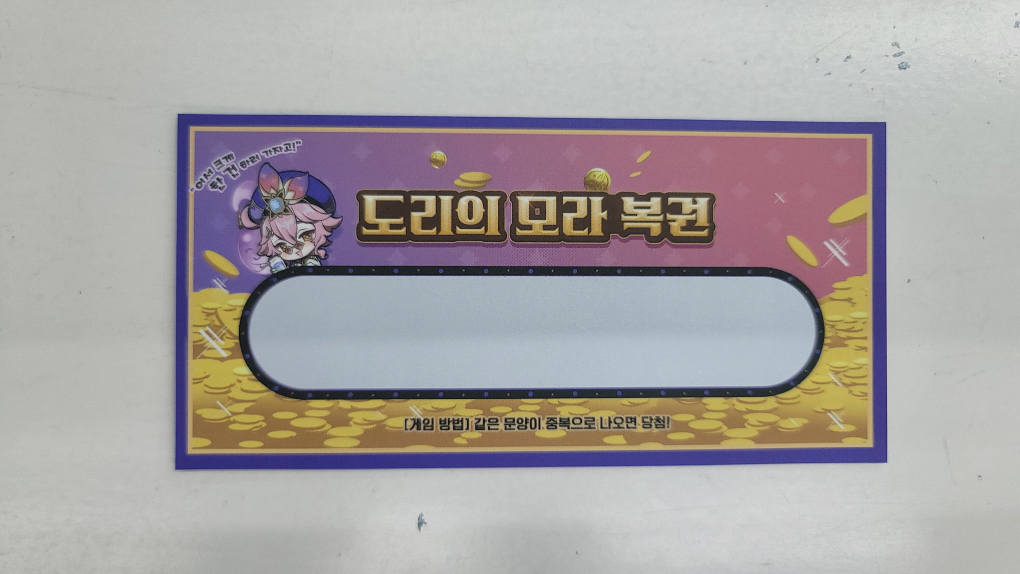 결제는 카드로 가능하며 도리의 모라 복권은 꽝이여도 5등 상품으로 5층에서 성유물 스티커를 랜덤하게 교환할 수 있어요.