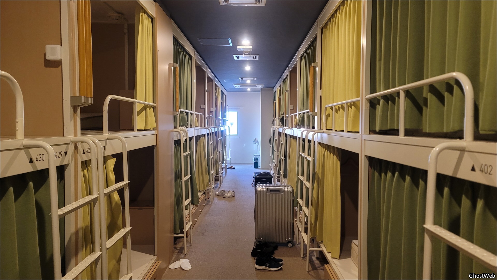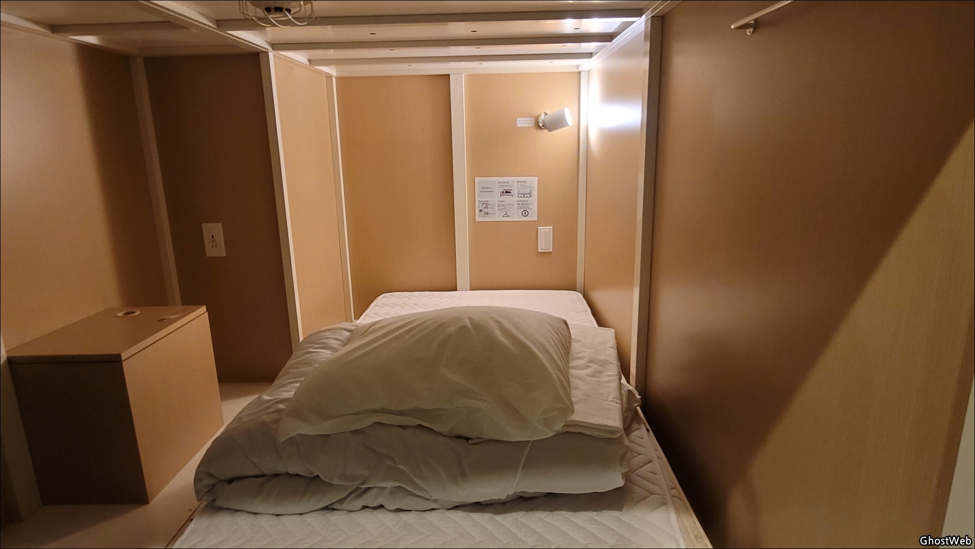 캡슐 안에는 110V 전기 콘센트와 개인용 금고(키)가 있어서 귀중품을 보관할 수 있는데, 침구류는 매일 교체해 주지 않으며, 침실 안에 짐을 넣을 수 없을 정도로 큰 짐은 입구 쪽에 보관하면 돼요.