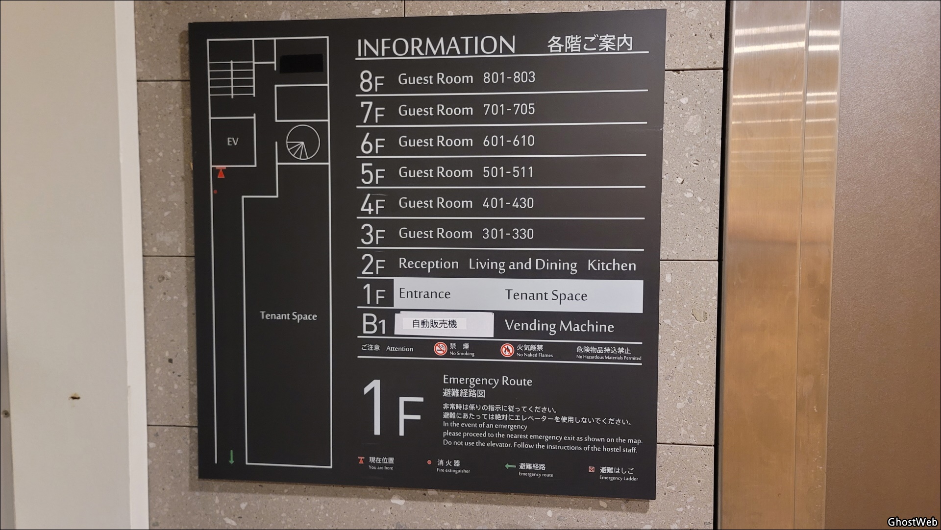 1층 왼쪽에 작은 출입문으로 들어가 엘리베이터를 타고 카운터가 있는 2층으로 올라가 체크인을 하세요.