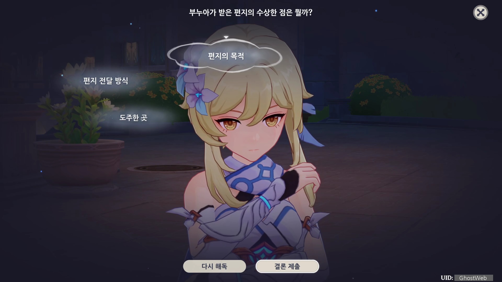 - 잃어버린 보니 선택 후 해독 진행, 편지의 목적 선택 후 해독 진행 및 결론 제출