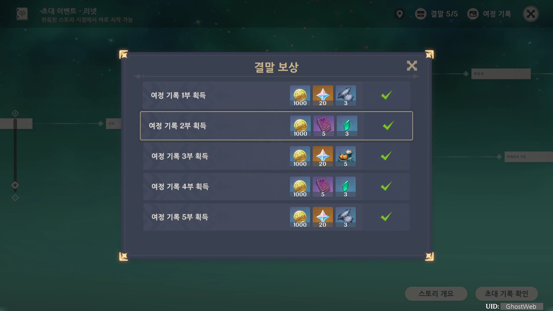 리넷 초대 이벤트 [제1막 - 고양이와 무작위 수]은 총 5개의 여정 기록(엔딩)으로 나눠져 있으며, 각 엔딩을 볼 때마다 원석, 경험치 책 등의 보상을 얻을 수 있어요.