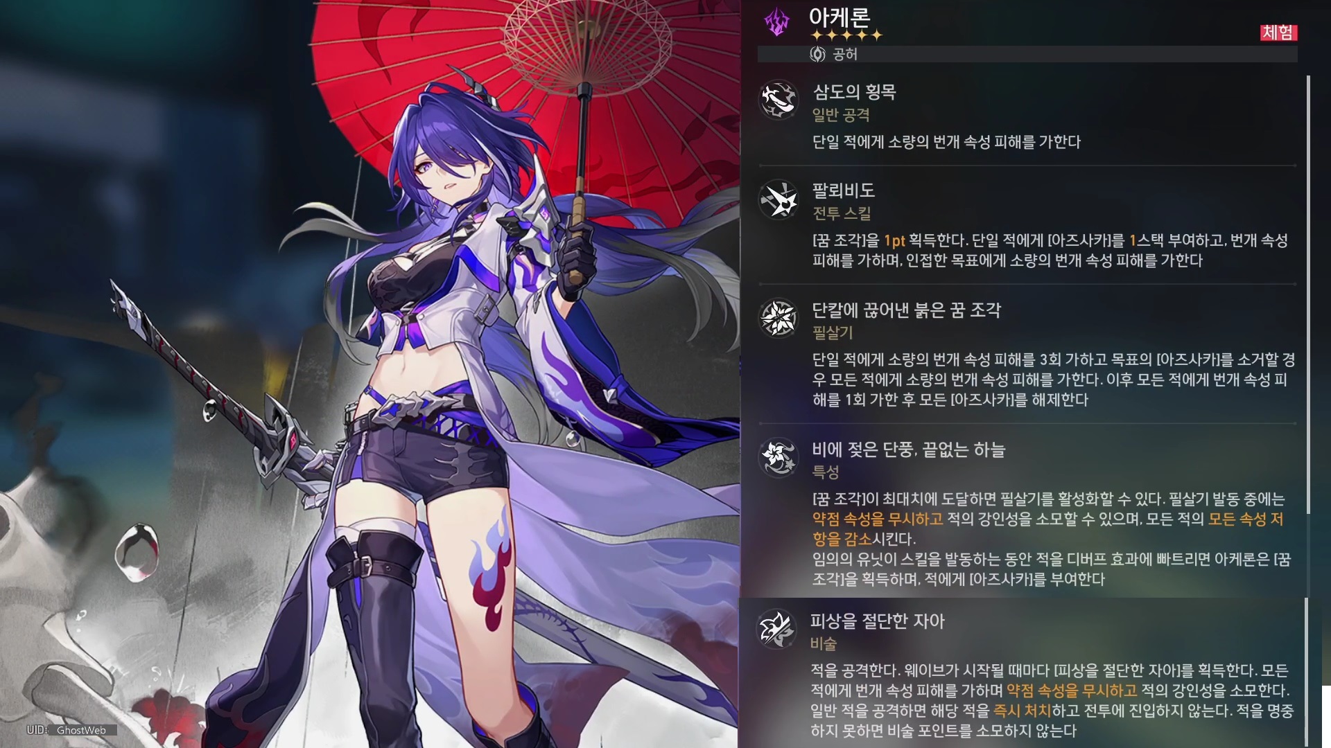 - 강화 - 꿈 조각이 9pt에 도달하면 필살기를 활성화할 수 있다. - 필살기 발동 중에는 약점 속성을 무시하고 적의 강인성을 소모할 수 있으며, 모든 적의 모든 속성 저항을 10% 감소시킨다. - 해당 효과는 필살기가 종료될 때까지 지속된다. - 임의의 유닛이 스킬을 발동하는 동안 적을 디버프 효과에 빠트리면 아케론은 꿈 조각 1pt를 획득하고 목표에게 아즈사카를 1스택 부여한다. - 만약 여러 목표를 디버프 효과에 빠트리면, 그 중 아즈사카가 가장 많은 적에게 아즈사카를 1스택 부여한다. - 해당 효과는 스킬을 발동할 때마다 최대 1회 발동한다. - 아케론이 필드에 있을 시 적이 퇴장 혹은 임의의 유닛에게 처치되면 보유한 아즈사카는 필드 내 아즈사카가 가장 많은 적에게 이전된다. |