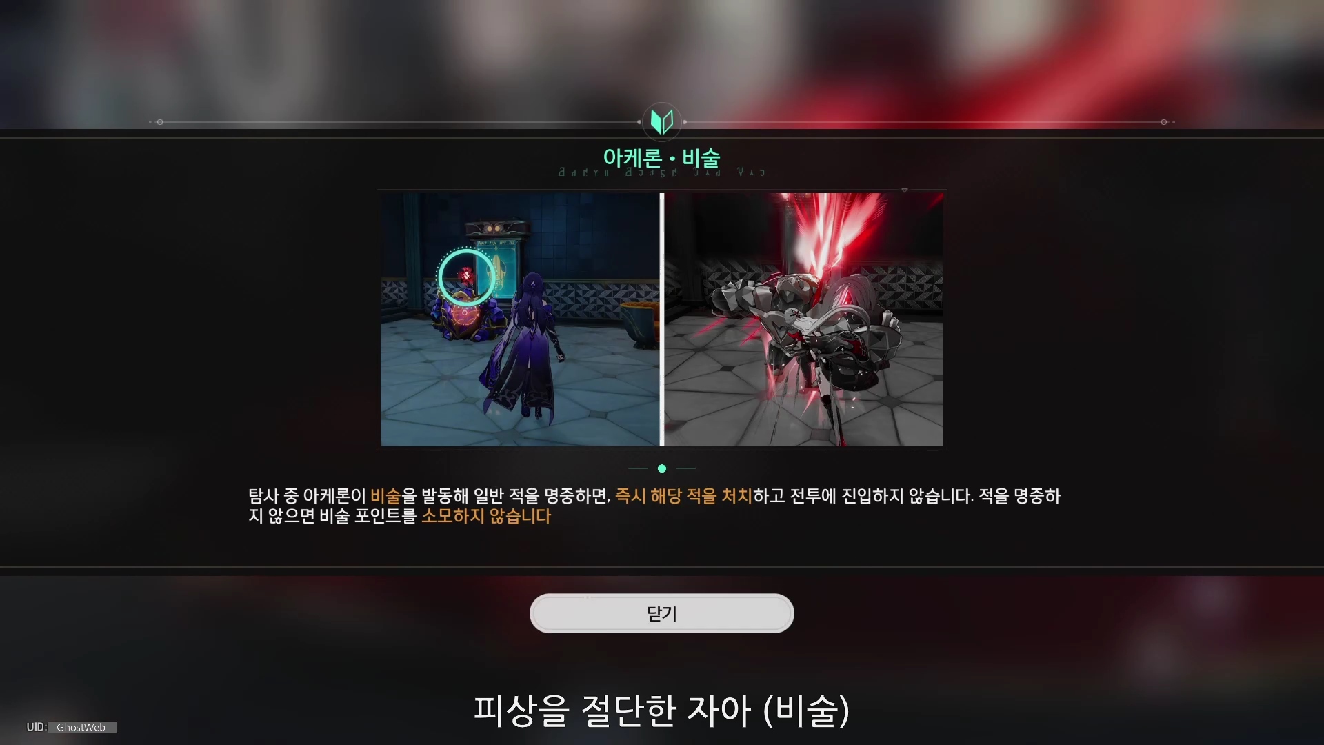 - 즉시 적을 공격한다. - 웨이브가 시작될 때마다 피상을 절단한 자아를 획득한다. - 모든 적에게 아케론 공격력의 200%만큼 번개 속성 피해를 가하며, 약점 속성을 무시하고 모든 적의 강인성을 소모한다. - 약점 격파 시 번개 속성 약점 격파 효과를 발동한다. [ 피상을 절단한 자아 ] - 필살기 발동 후 아케론은 꿈 조각 1pt를 획득하고, 랜덤 단일 적에게 아즈사카를 1스택 부여한다. - 일반 적을 공격하면 해당 적을 즉시 처치하고 전투에 진입하지 않는다. - 적을 명중하지 못하면 비술 포인트를 소모하지 않는다. |