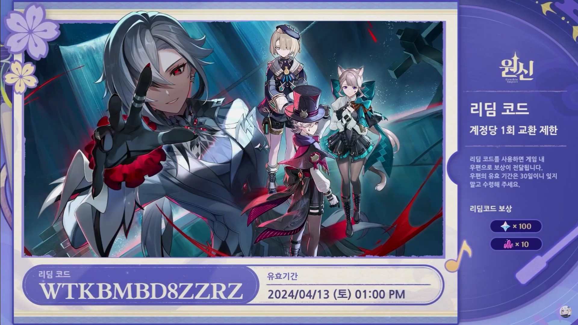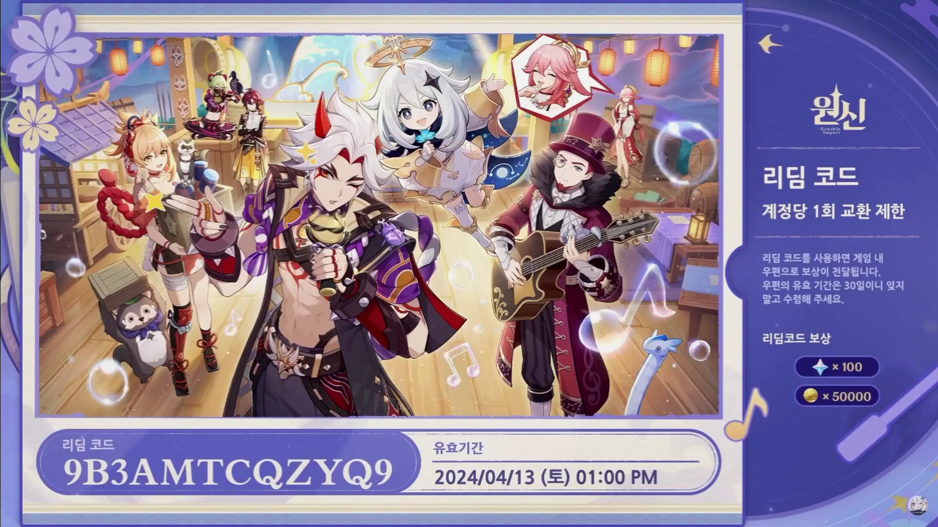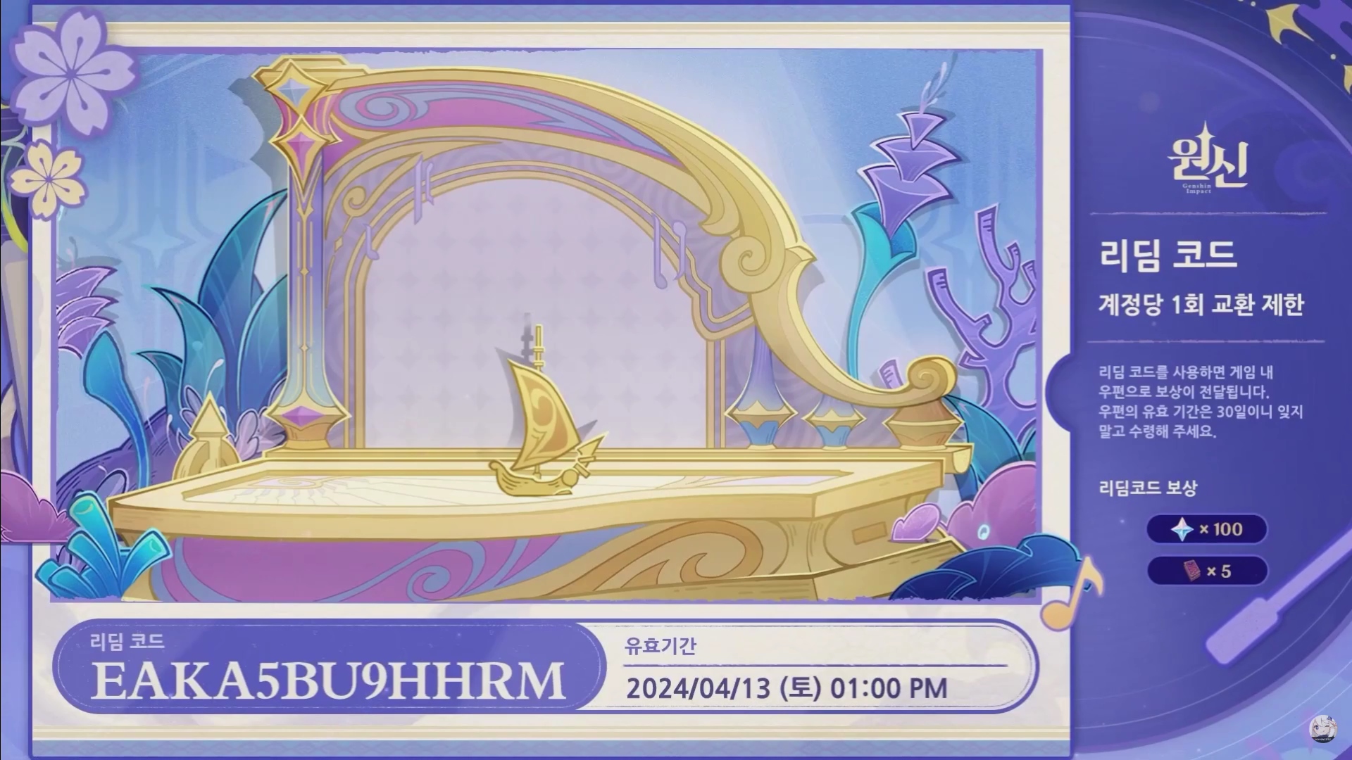 원신 업데이트 특별 방송 등을 보면 중간 마다 리딤코드라는 것을 보여주는데 이를 원신 홈페이지에서 입력하면 원석과 각 코드별로 아이템을 얻을 수 있어요. ※ 유효기간은 대부분 특별 방송