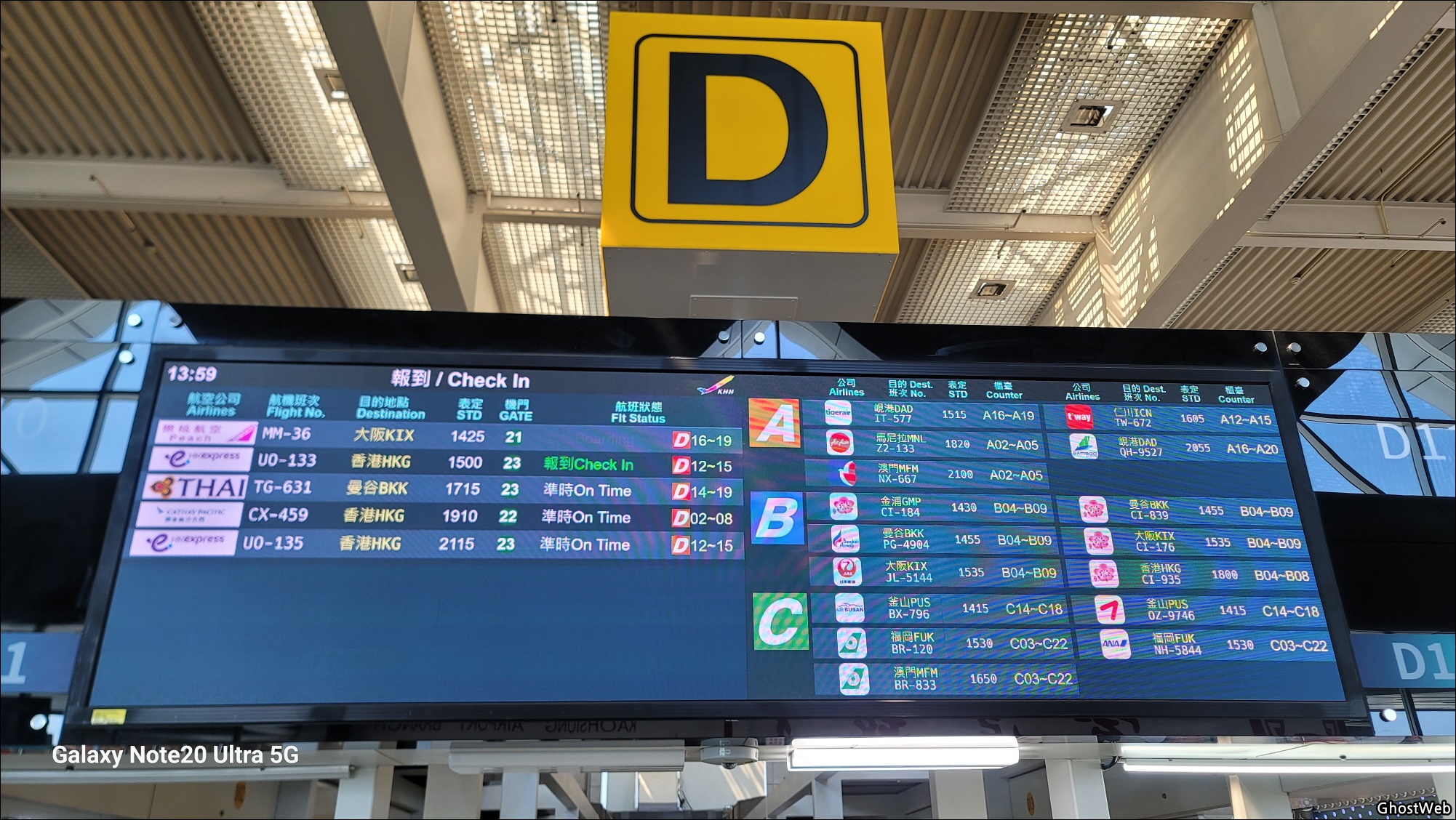 각 전광판에 각 비행사의 카운터 알파벳 정보와 비행기 편명, 시간 등의 정보를 볼 수 있으며, 24년 4월 기준 티웨이 항공은 A 카운터, 아시아나 항공은 C 카운터를 사용하고 있는 것으로 보이네요.