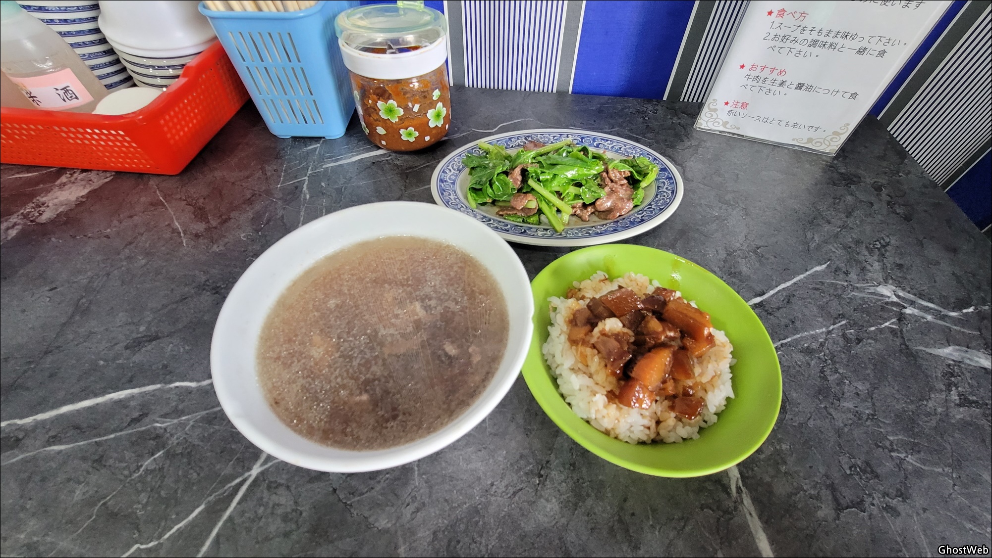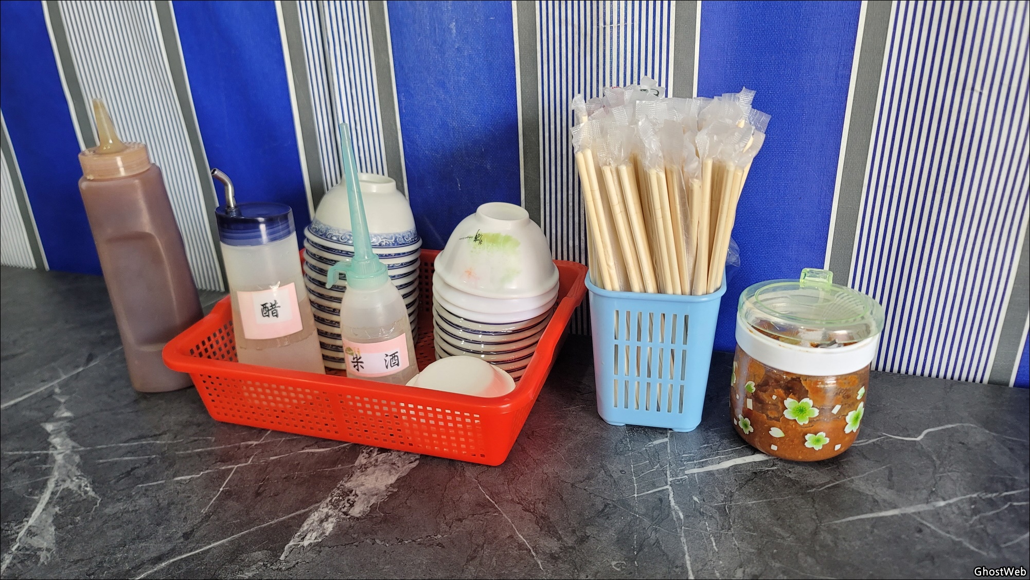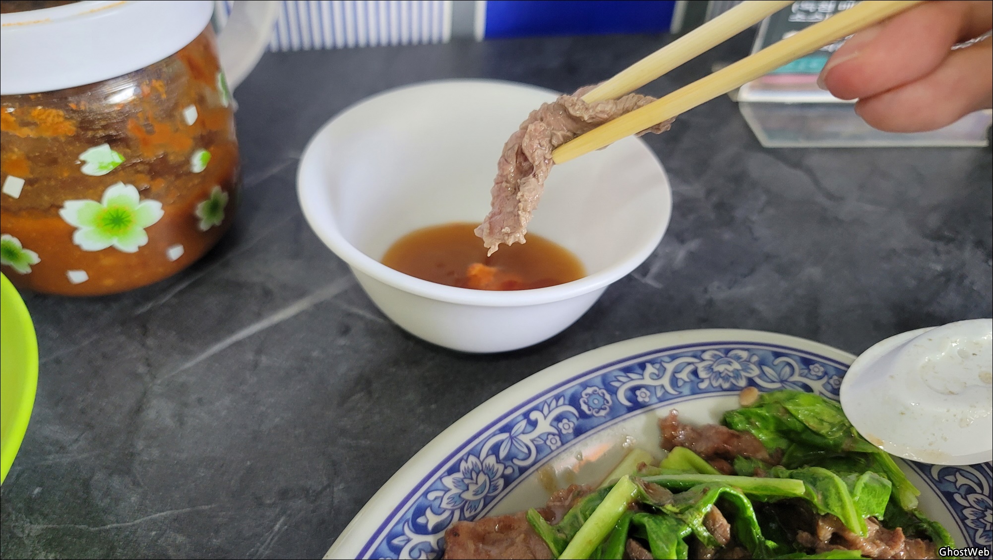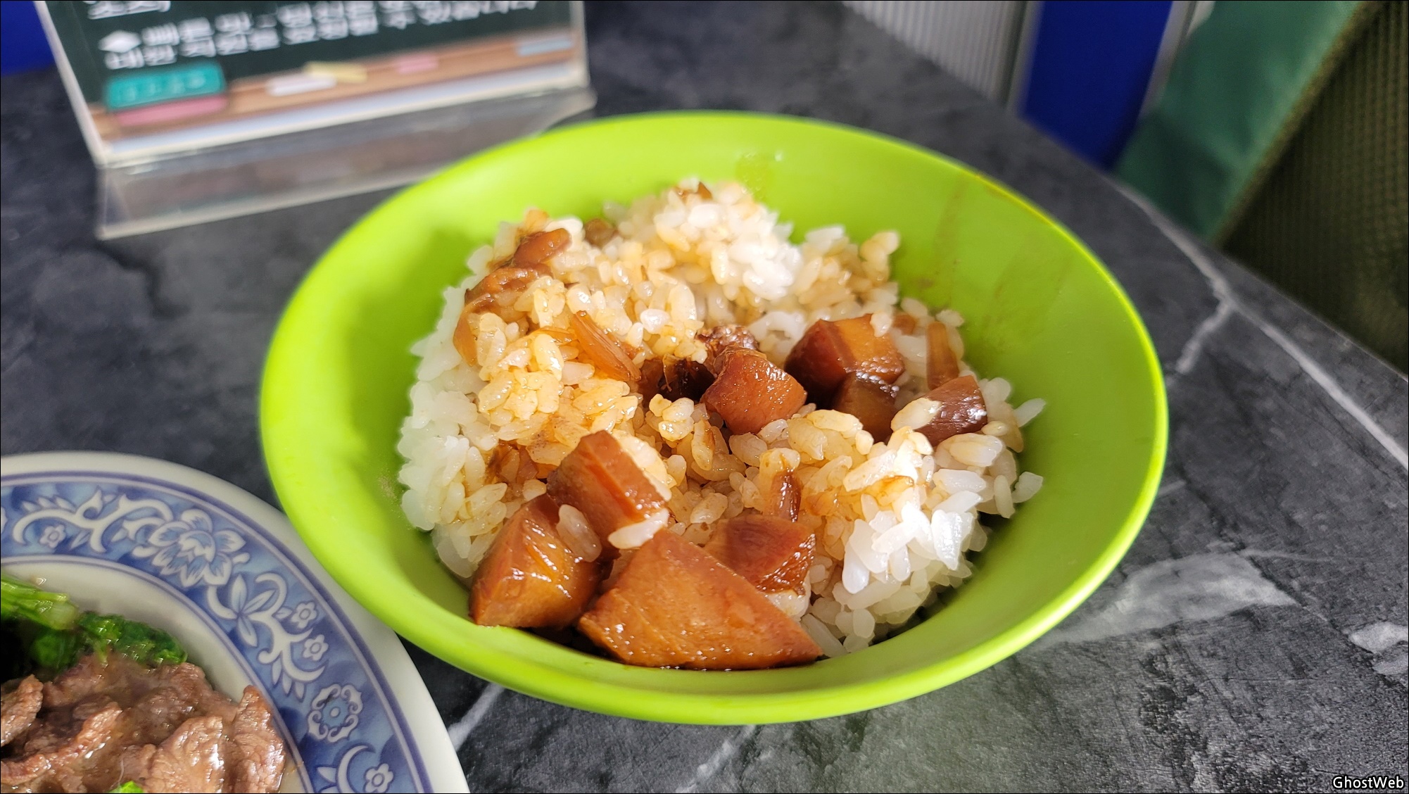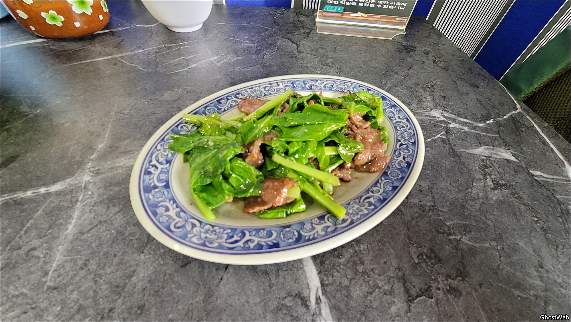 조식 음식점으로 영업 시간이 오후 1시까지인데 12시쯤 방문하여 빠르게 한국어 메뉴판을 보고 소고기탕(돼지고기 덮밥)과 동갓볶음을 주문하고 결제하고 옆 건물에 있는 자리로 안내 받았어요.