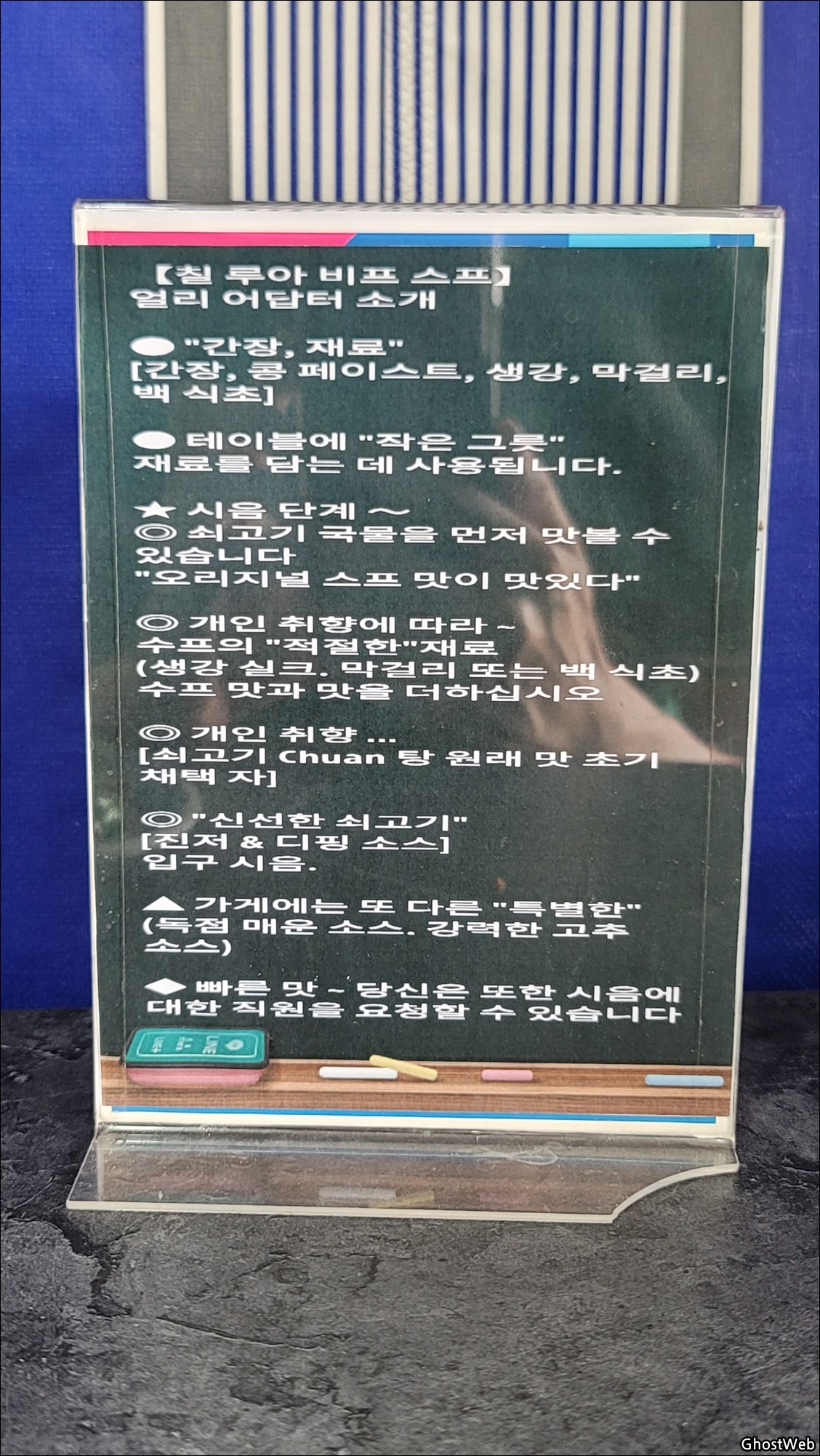 자리에 앉아 음식이 나오길 기다리면 직원 분이 음식과 함께 맛있게 먹는 방법이 써 있는 안내판을 함께 가져다 주세요.