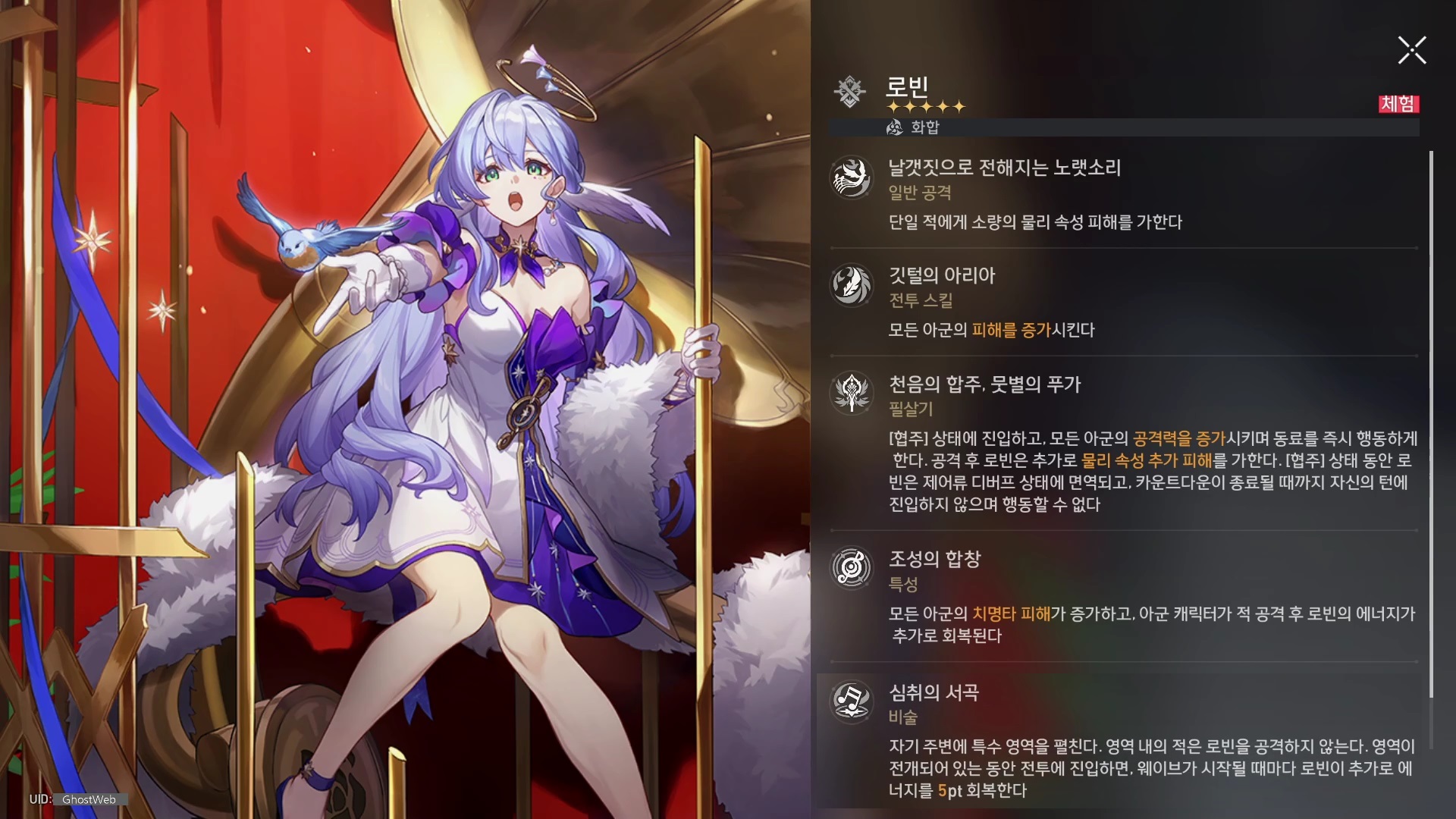 | 1 | 미소의 국가 | 협주 상태일 시 모든 아군의 모든 속성 저항 관통이 24% 증가한다. |