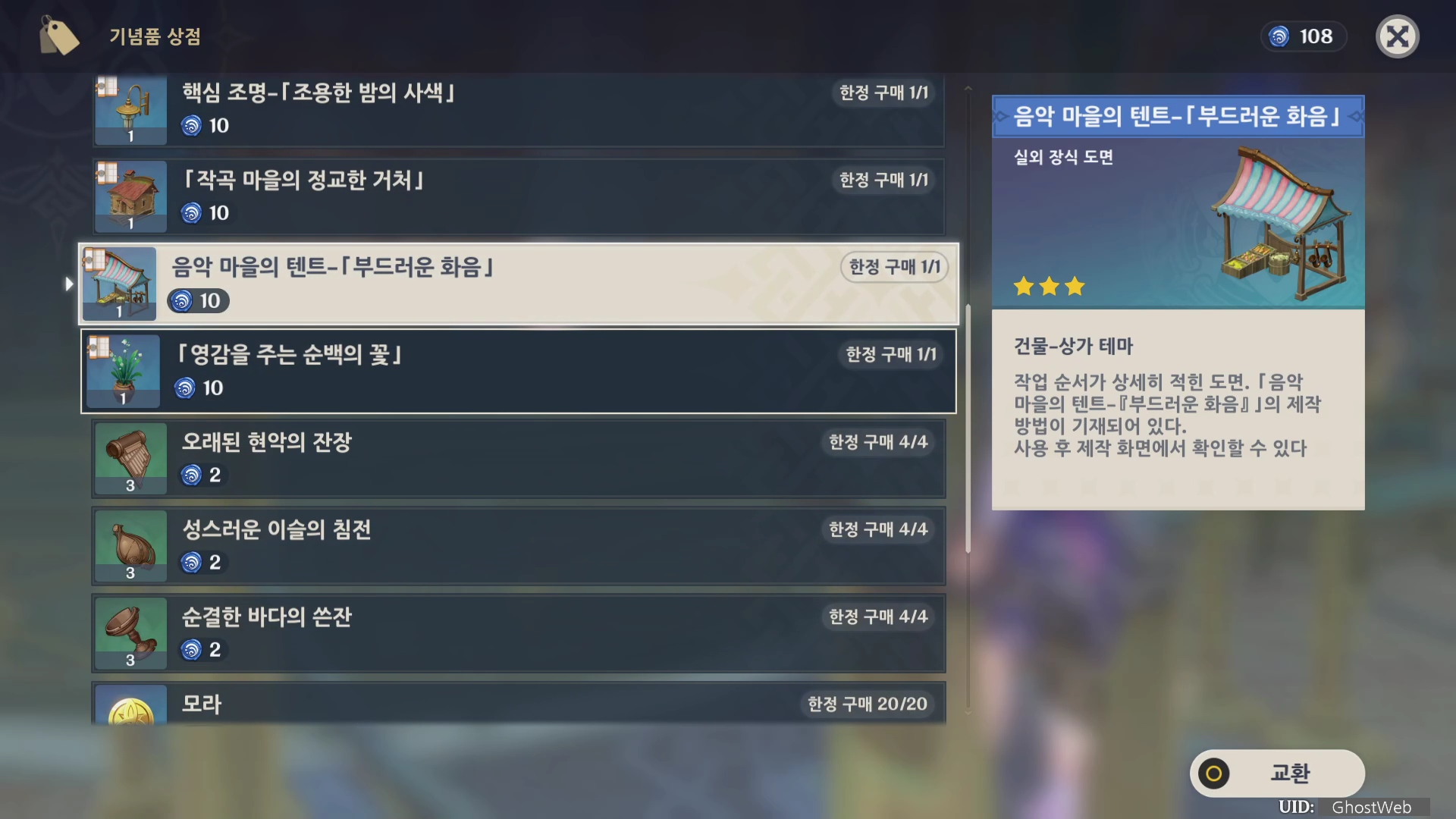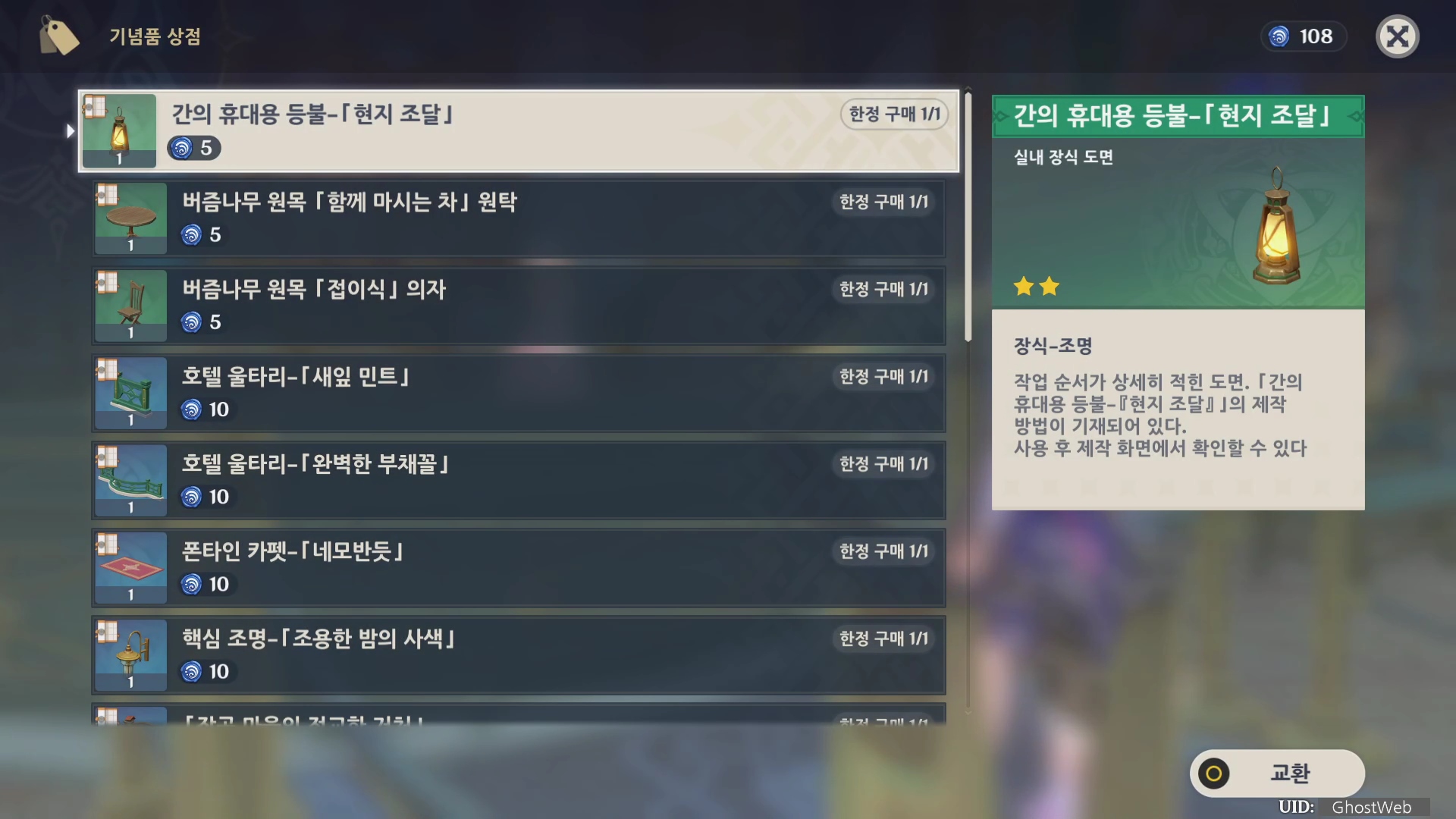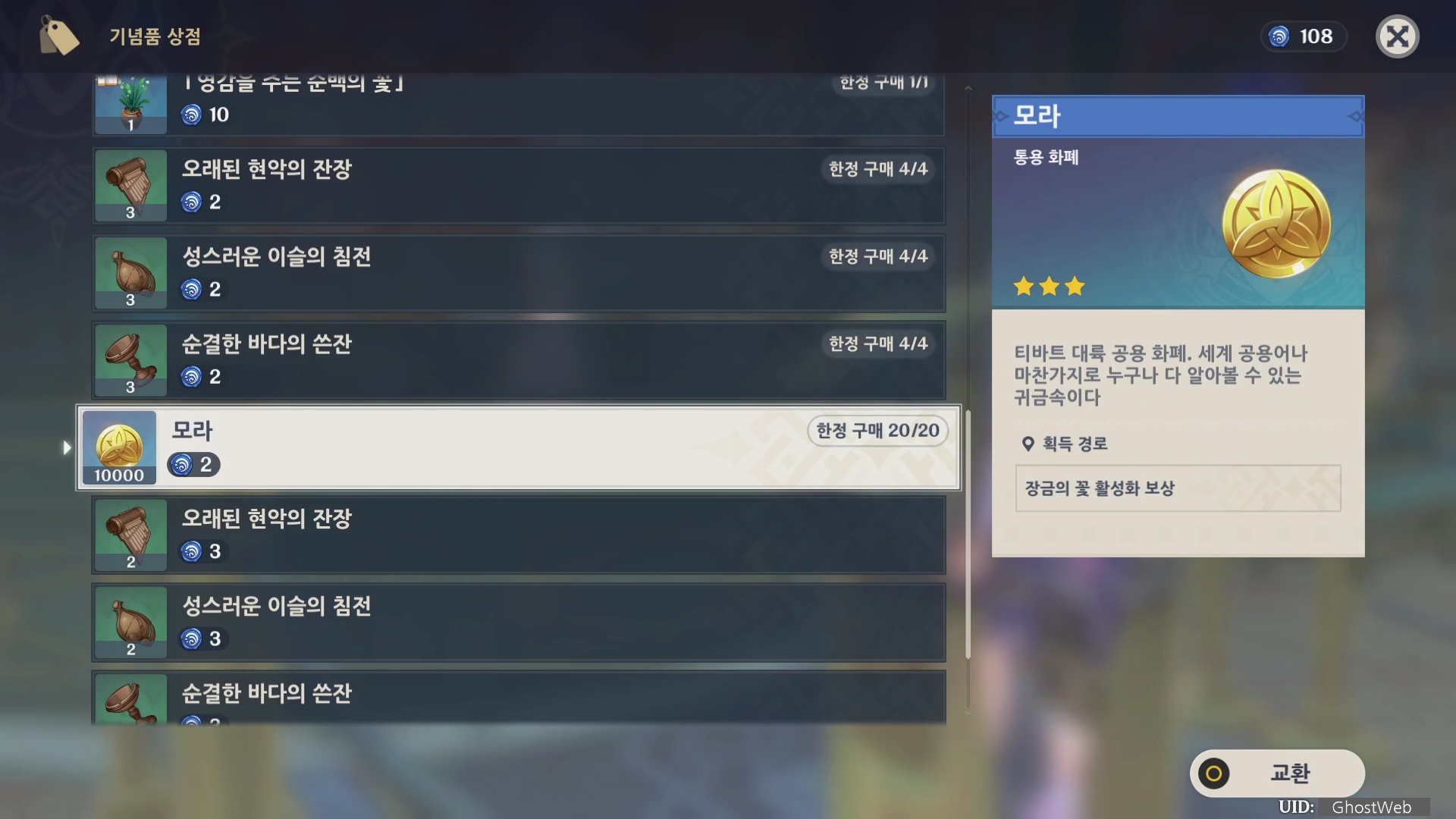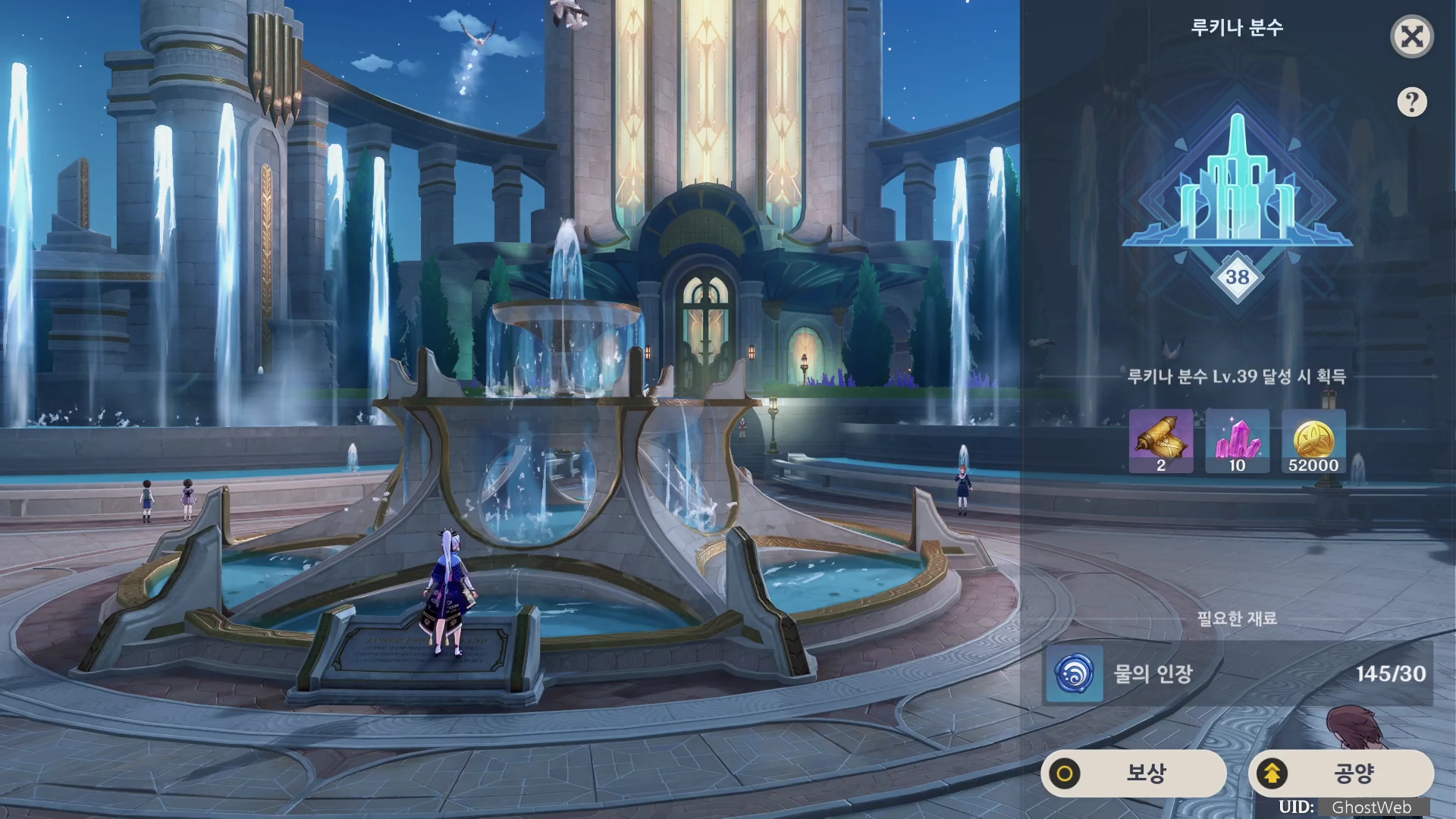 루키나 분수 레벨을 최대로 올려 베르탱 신비 상점 활성화가 되면 물의 인장을 소모하여 실내 장식 도면, 무기 돌파 소재, 모라 등으로 교환할 수 있어요.